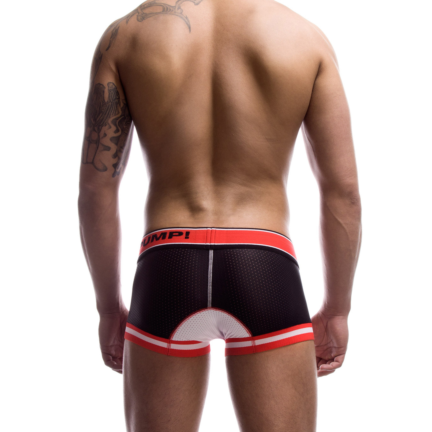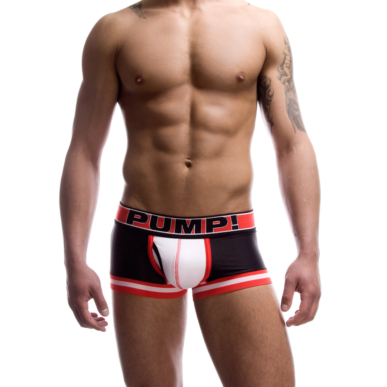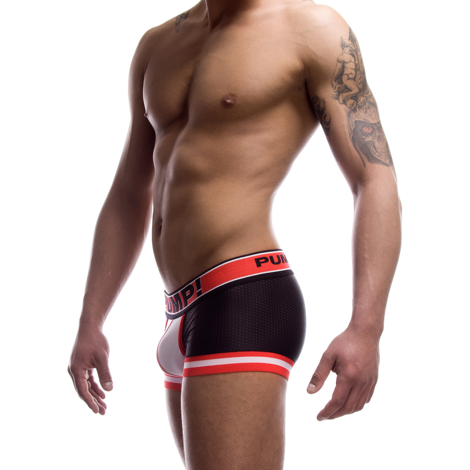 Keep your confidence from the locker room to the bedroom with our PUMP! Touchdown Falcon boxer. The combination of black, white and red creates a fun, sporty style. This boxer will stay close to your body with its fitted elastic and breathable micro-mesh design. Plus, you have a full cotton double-lined cup to give you extra comfort and support. Choose from four sizes to fit your body shape.
