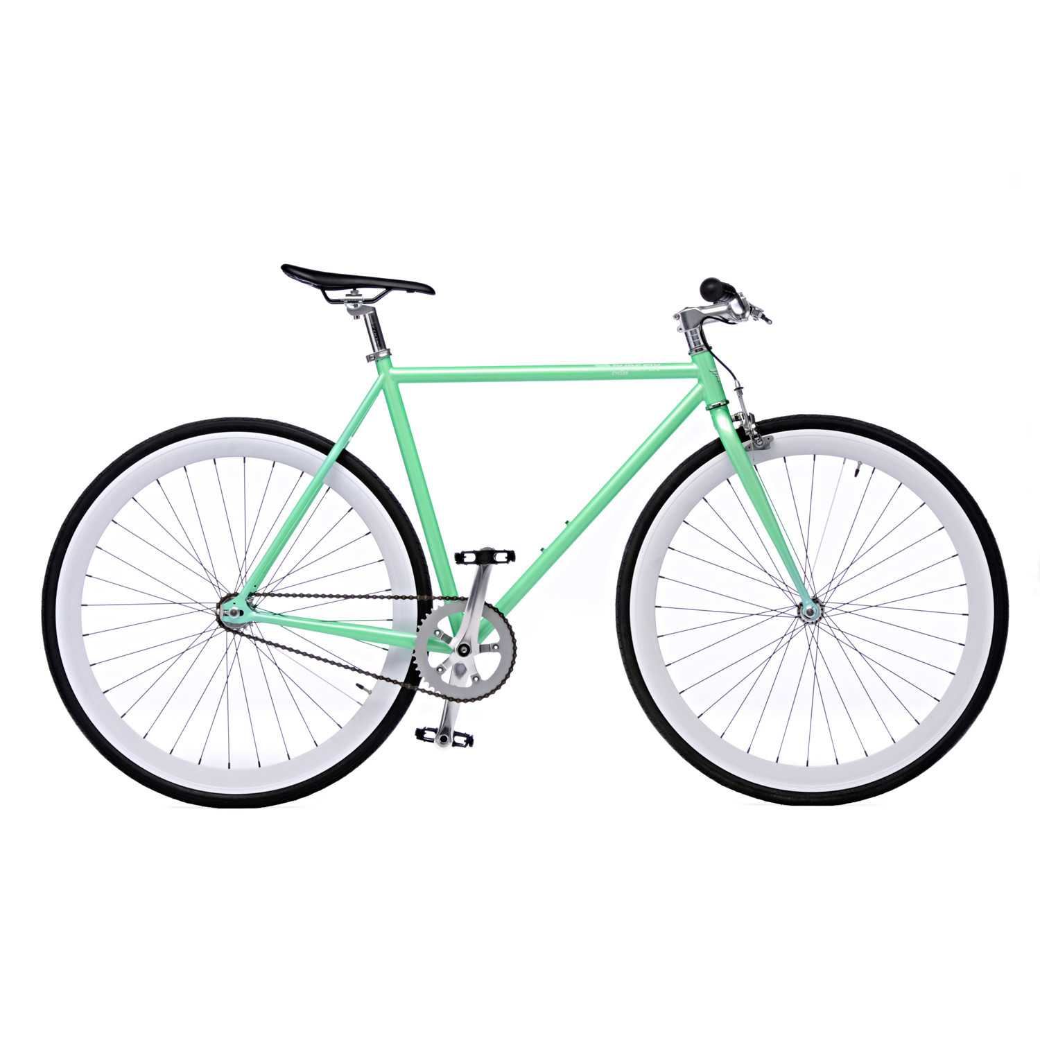 Victor is so fresh and so clean with a mint green frame and white deep dish wheels. Tool around on this cycle for a preppy statement that's as functional as it is stylish. Pure Fix cycles feature a flip-flop rear hub that gives riders the option of riding fixed gear or single speed.