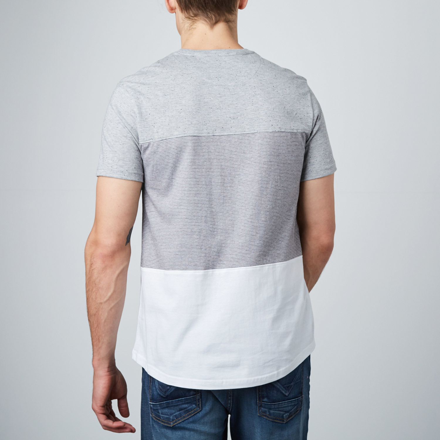 Color Blocked Long Curved Hem Neppy Yarn and End on End Striped Tee with a Patch Pocket