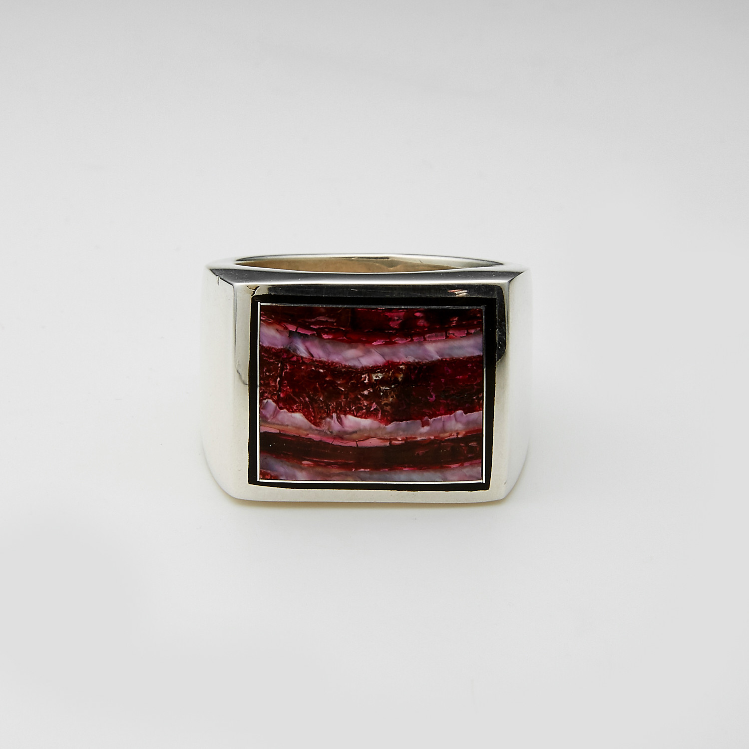 In the shadows of the Sangre de Cristo mountains of New Mexico, sits a century-old adobe ranch house where artisans craft rare and gorgeous knives, jewelry, and more by hand. This extraordinary ring from Santa Fe Stoneworks is an quintessential example of their team's skill and artistry. Featuring a timeless, sterling silver body, this ring is inlaid with genuine Wooly Mammoth tooth, resulting in a one of a kind fusion of expert craftsmanship, classic style, and unique natural beauty that adds a daring edge to any formal or casual look.