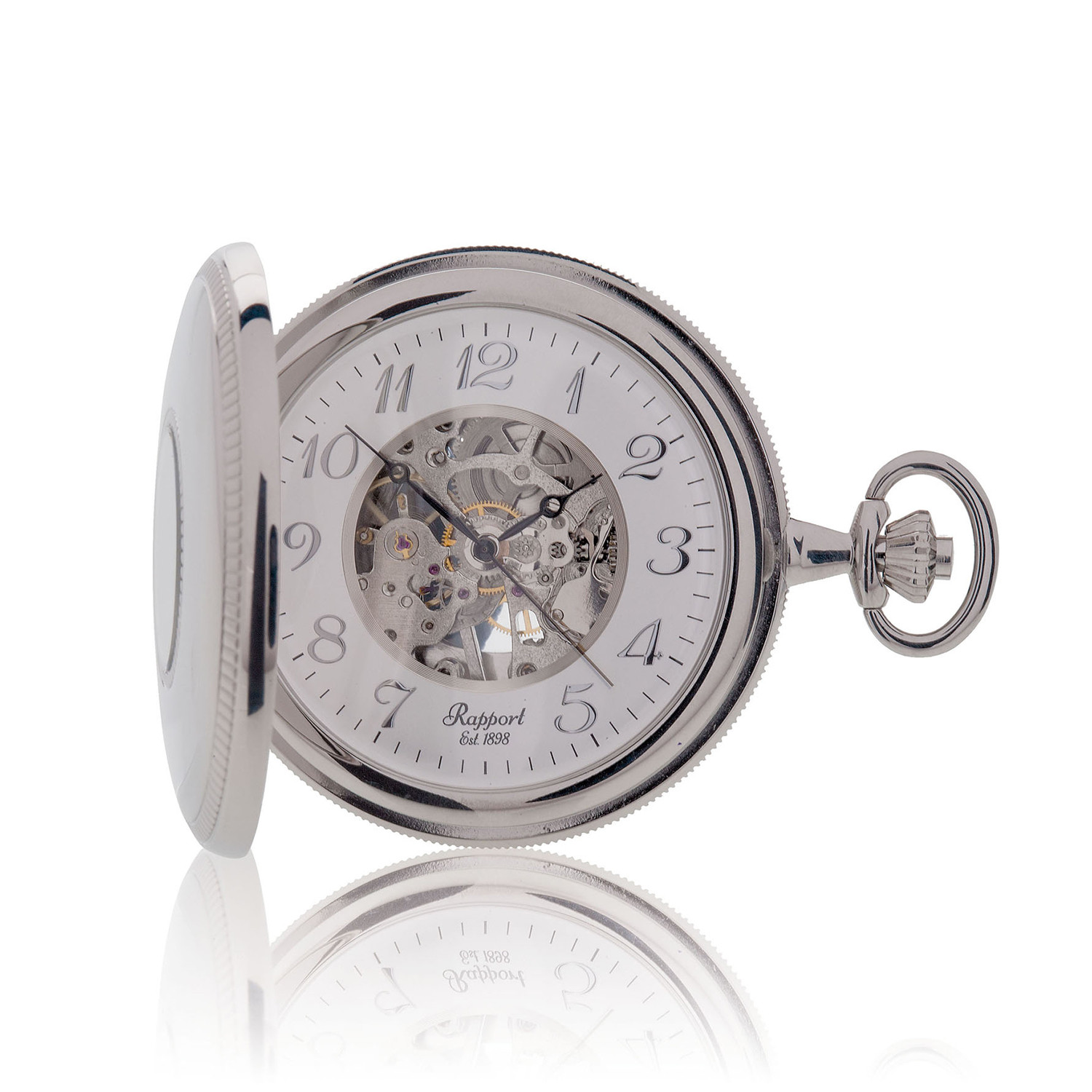 The incredible Skeleton Movement Half Hunter Pocket Watch features a traditional hinged presentation case with a silver Arabic skeletonized dial and 17 jewel movement powering it.