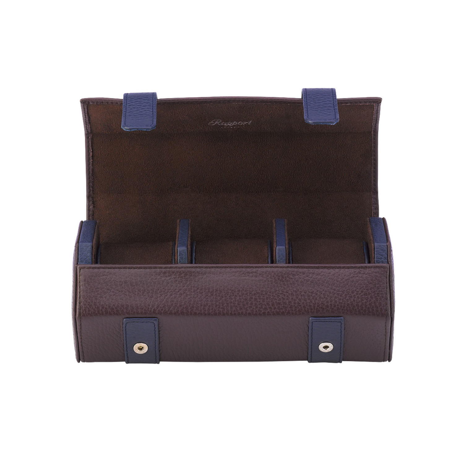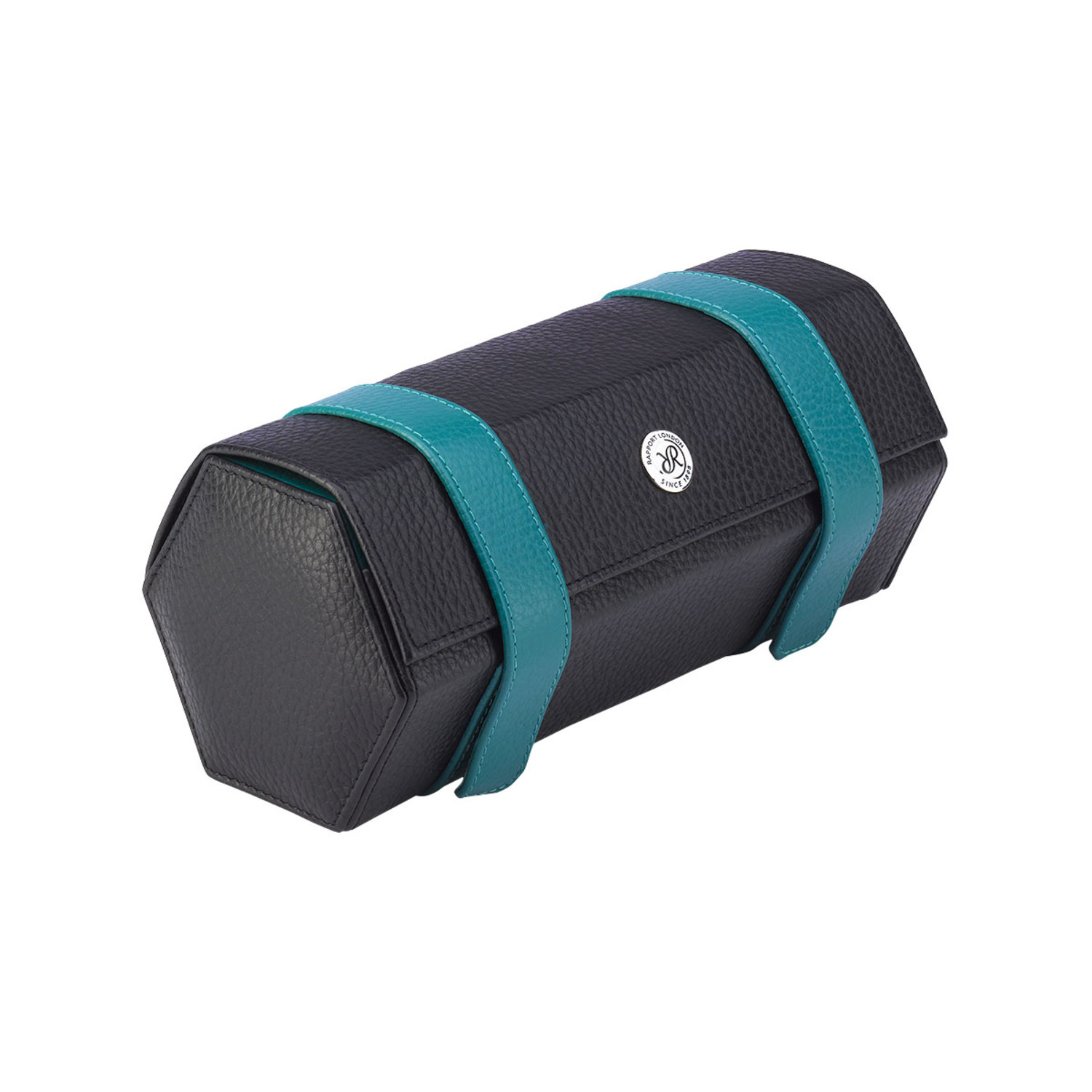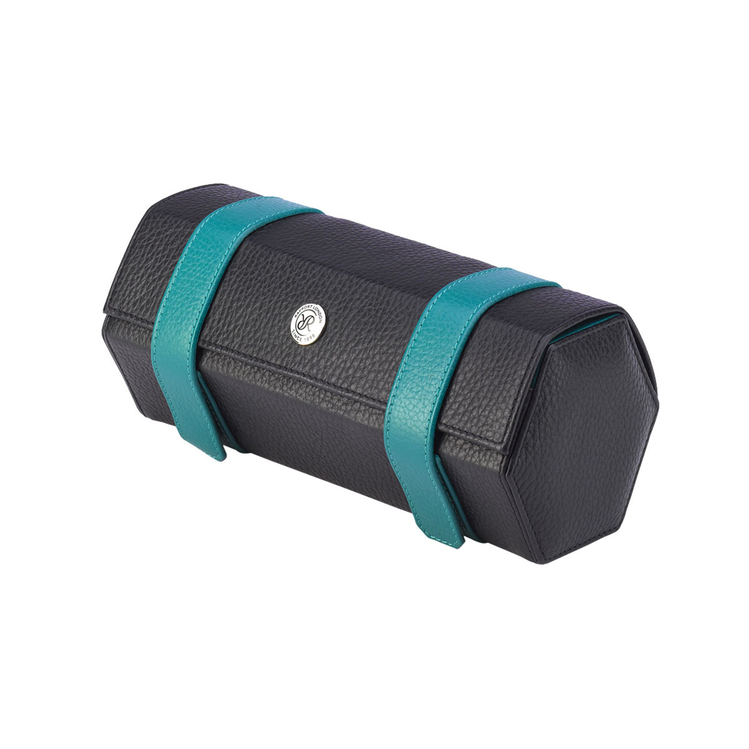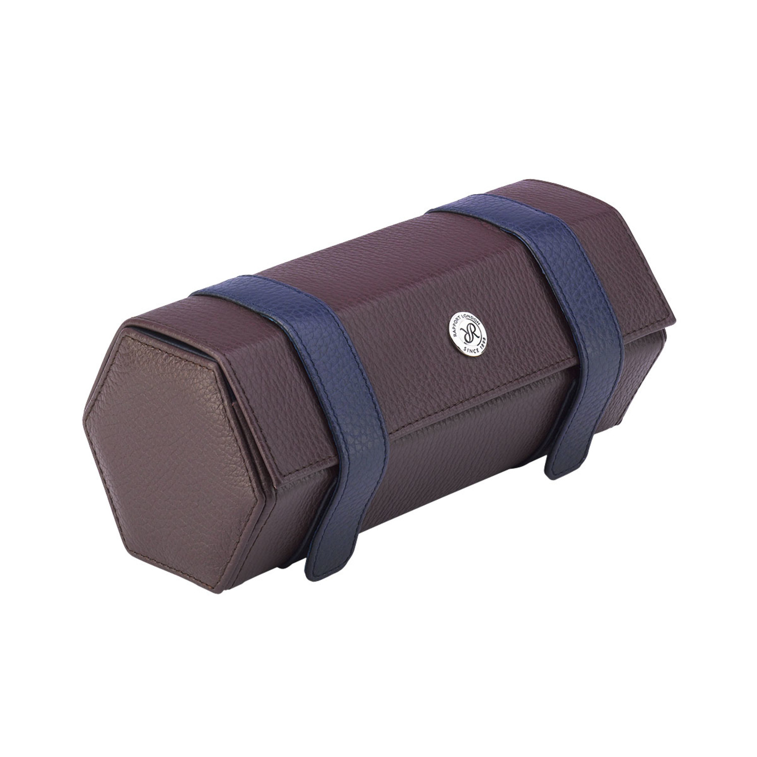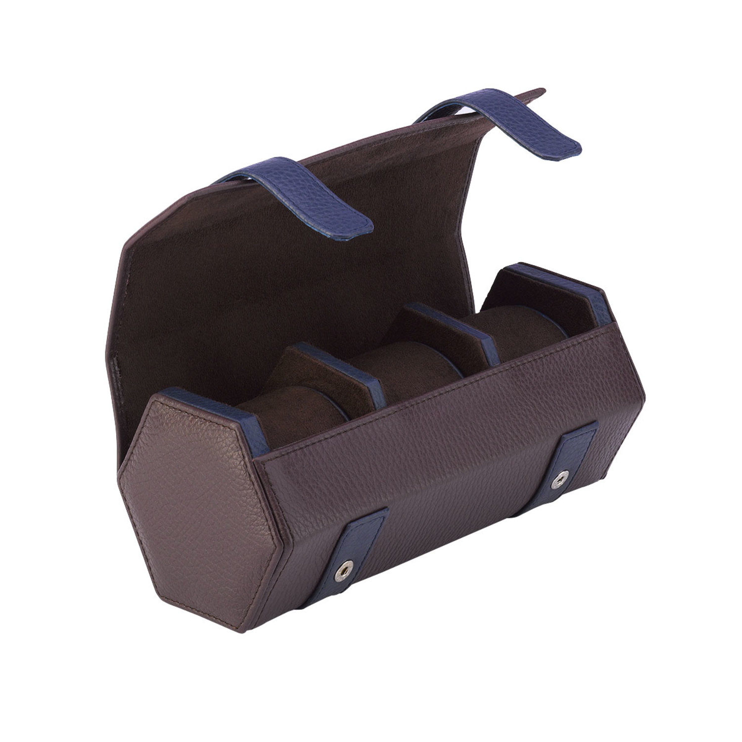 The Hyde Park Hexagonal Three Watch Roll is a robust case handmade from genuine leather with finely stitched seams. It features a luxurious suede lining and a matching removable soft cushions with elegant contrast colored leather sides to securely hold three watches.