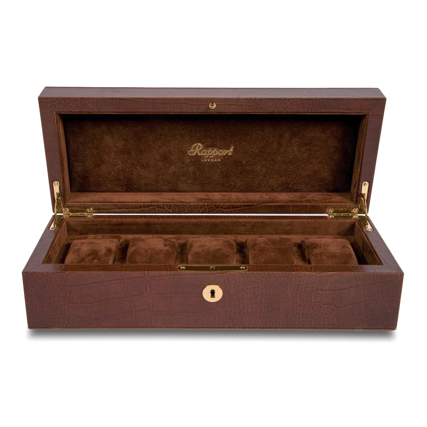 The Leather 5 Watch Collector Box is a craftsman made box covered with genuine leather, embossed with crocodile skin pattern. The interiors are velvet lined and the cushions which secure watches in the compartments are adjustable to take any size watch. Boxes are fitted with a lock and metal fittings on the black version are chrome plated.