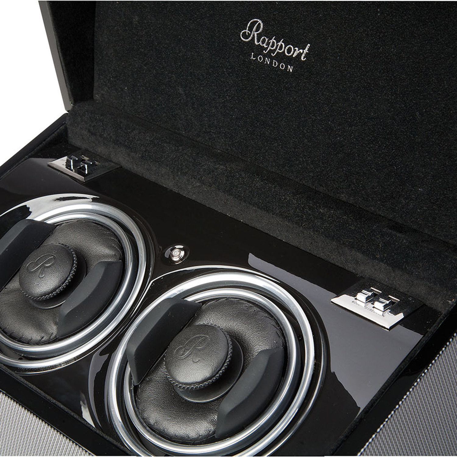 The Vogue range of watch winders takes Rapport’s standard collection to the next level. The interiors of this collection are finished in highly polished wood while the controls, feet and hinges are chrome plated. The watches are held on a fully adjustable clip that has a leather covered soft pad and rubber grips and which slot into cups inset into the body of the winder. These models feature Rapport’s Optima Drive System with advanced programmability to tailor the winder to the specific needs of your fine automatic watch.. AC adapter included. 2 Year warranty.