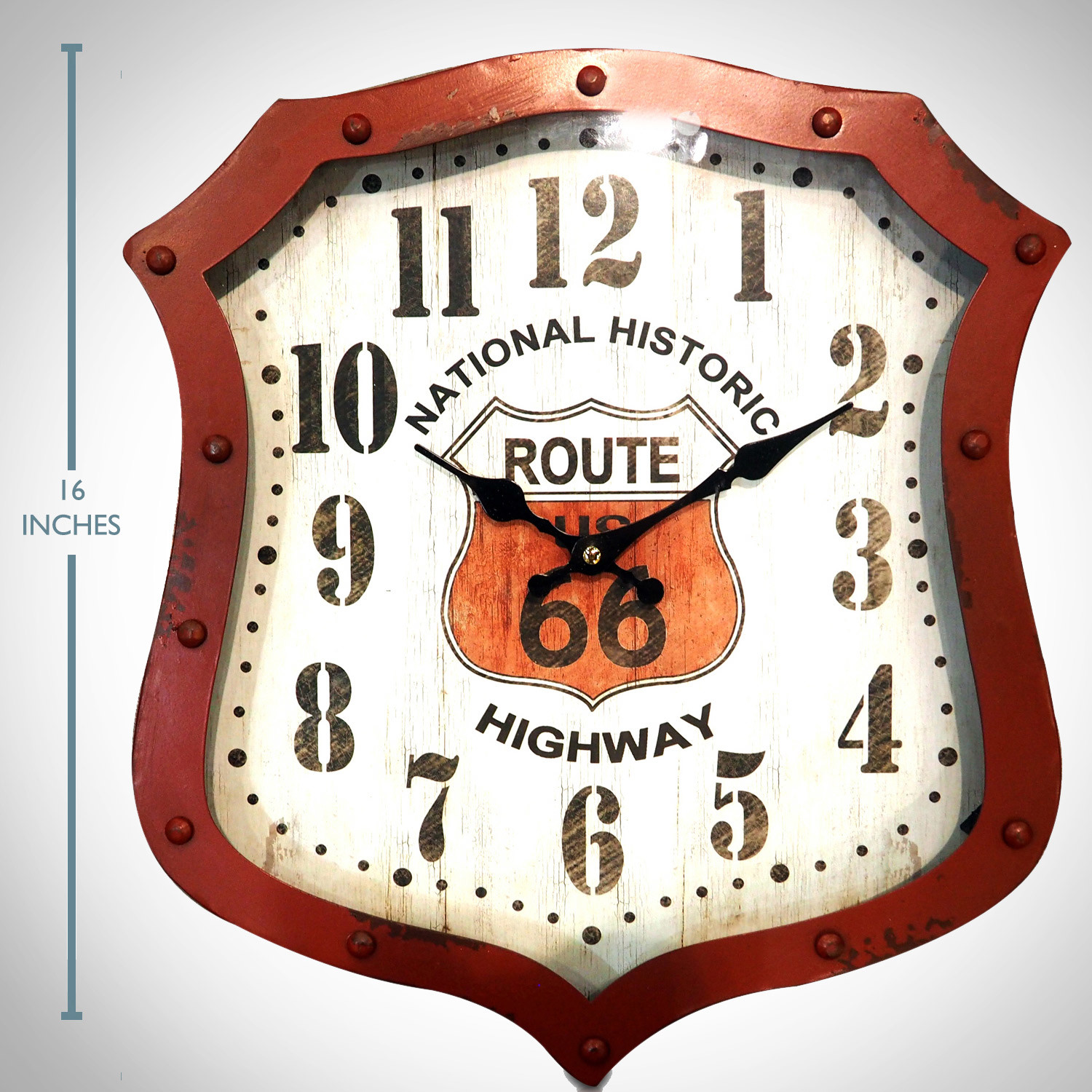 Decorate your business, home, or office with this weathered metal riveted frame 'Historic US Route 66" Clock. This piece of industrial art at its best has a great vintage patina, with a used and abused finish that's the perfect addition to your unique decor.