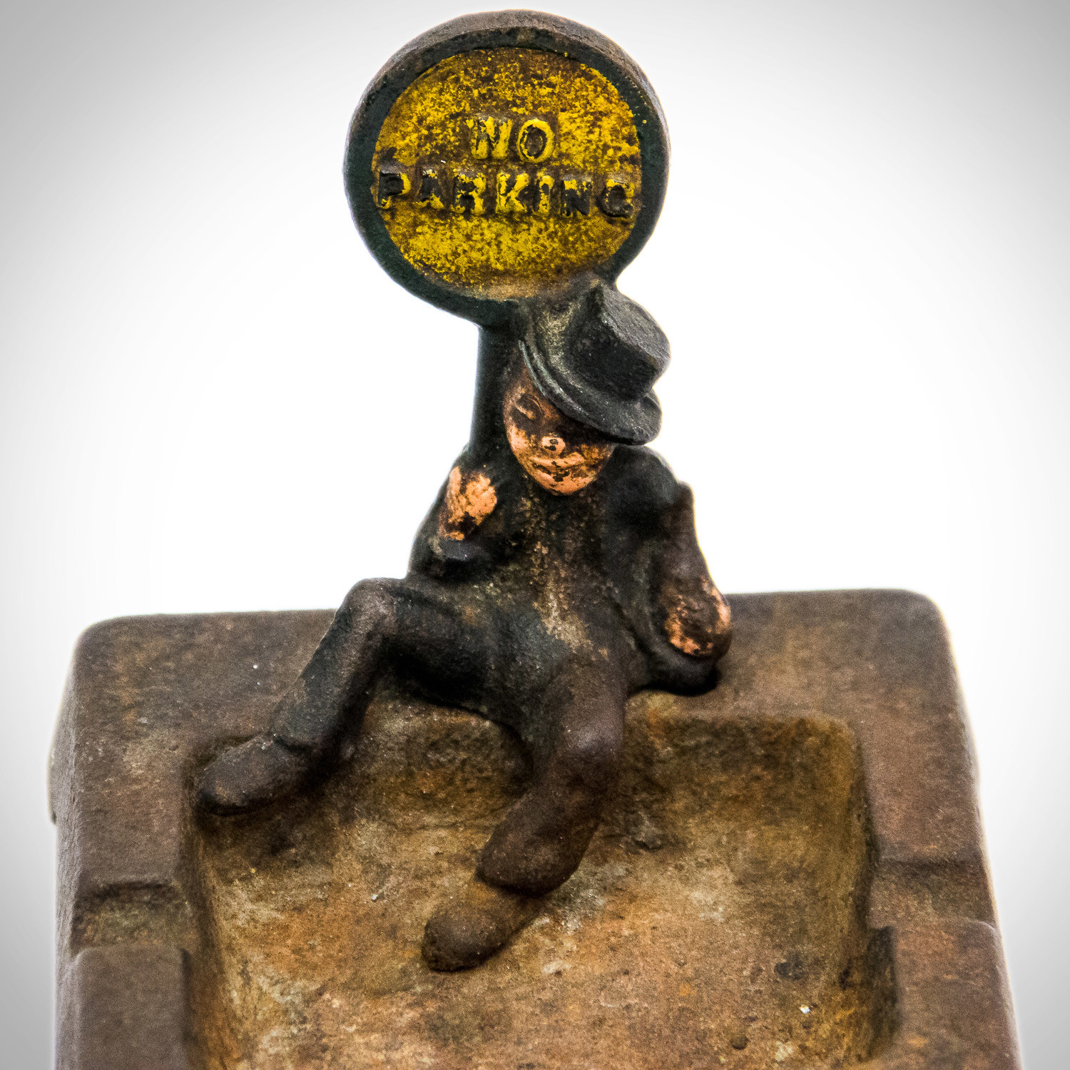 Decorate your business, home, or office with this original, weathered-patina cast iron Drunk Man holding on to No Parking street sign Pub/Tavern/Bar Ashtray - a true relic from the days when doctors smoked in your face during consultations.
