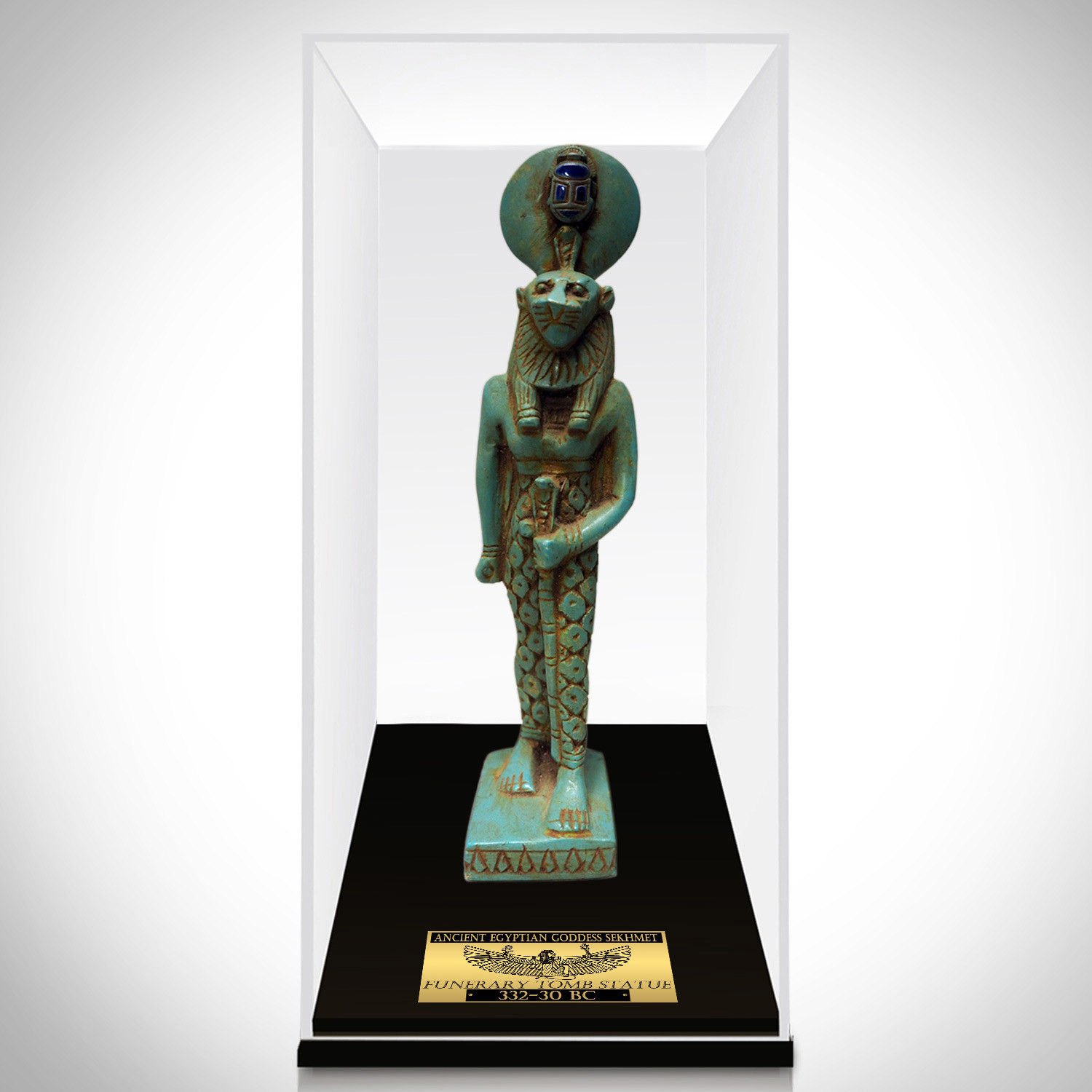 This custom museum display showcases an authentic Egyptian Warrior goddess Sekhmet statue dating from the Ptolemaic Period 332–30 B.C. This ancient Egyptian tomb statue features a beautifully carved Sekhmet statue, depicted here as a human with a lion head, with a long tripartite wig, broad collar necklace, holding a sceptre in the form of a papyrus (A symbol of authority, power and control), and wearing solar disk and uraeus-cobra headdress - The Uraeus is the stylized, upright form of an Egyptian cobra used as a symbol of sovereignty, royalty, deity and divine authority in ancient Egypt. The Sun Disc (Aten) is a symbol of god Ra. The deified Aten is the focus of the monotheistic religion of Atenism established by Amenhotep IV, who later took the name Akhenaten (died ca. 1335 BCE) in worship and recognition of Aten, the creator, giver of life, and nurturing spirit of the world.
