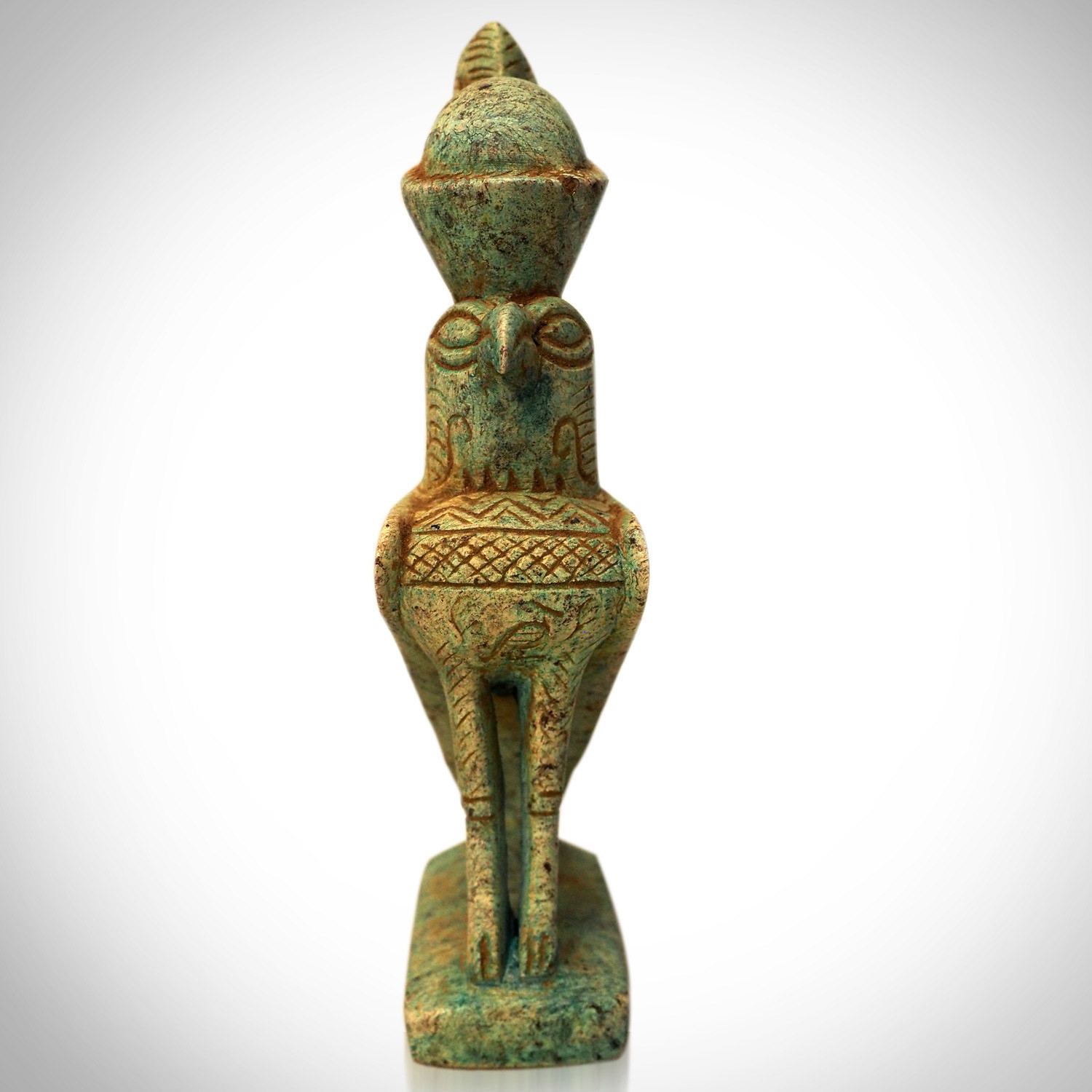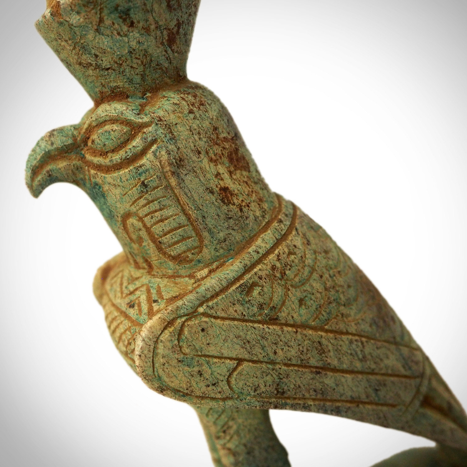 Horus served many functions, most notably being a god of kingship and the sky. This statue was finely carved with a defined Falcon head wearing the pschent crown, as a symbol of kingship over the entire kingdom of Egypt.
