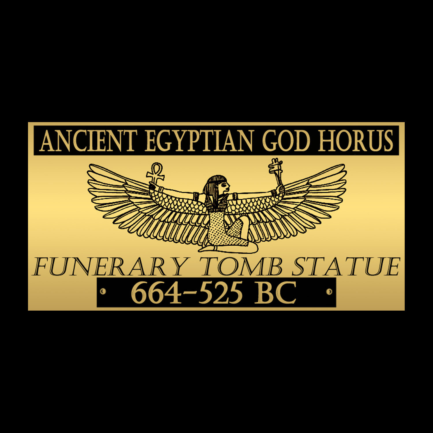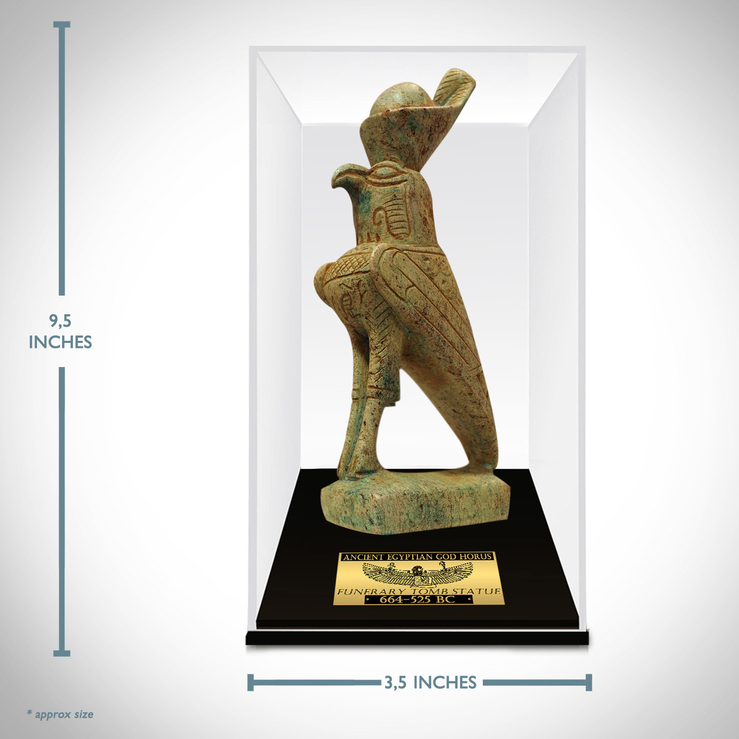 This custom museum display showcases an authentic Carved God Horus Tomb Statue dating from 664-525 BC, part of the 26th Dynasty. This ancient Egyptian tomb statue features a stone carved Horus of The Winged Disk, the first known national god, specifically related to the king who in time came to be regarded as a manifestation of Horus in life and Osiris in death. The most commonly encountered family relationship describes Horus as the son of Isis and Osiris, and he plays a key role in the Osiris myth as Osiris's heir and the rival to Set, the murderer of Osiris.
