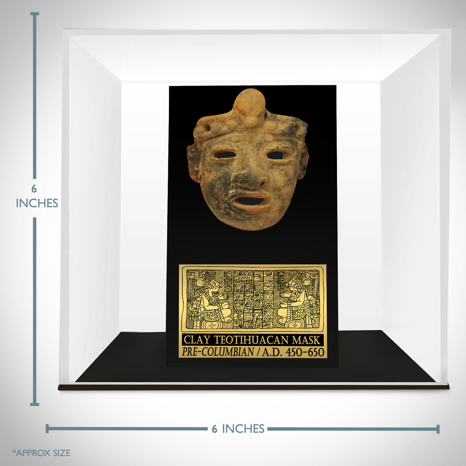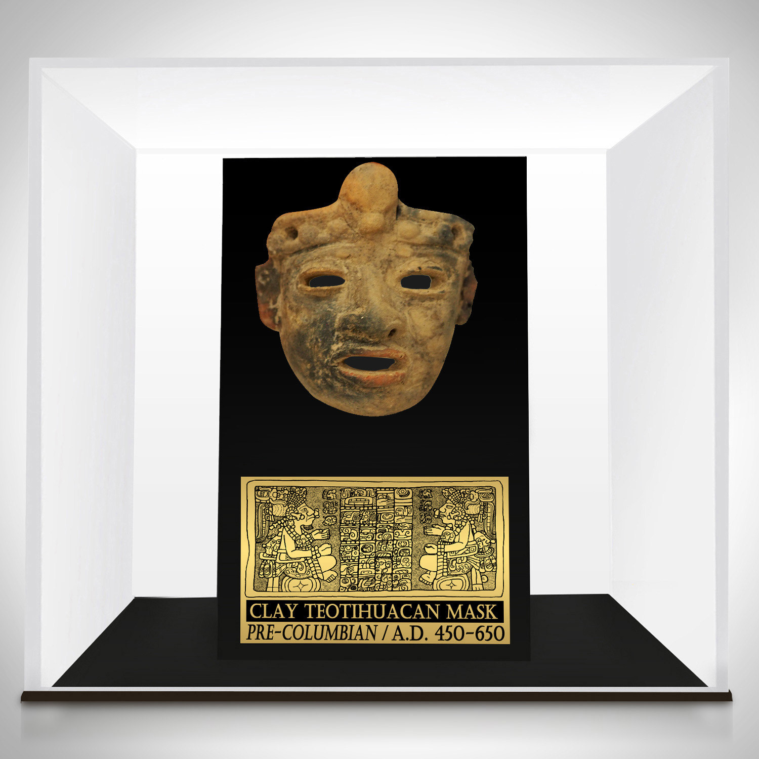 This custom museum display showcases an authentic Clay Teotihuacan pre-columbian Mask dating from A.D. 450-650. Soft and delicately modeled - This 'commoner class' scaled version has well modeled youthful gently parted lips and rounded high cheekbones, narrowed oval eyes, flanged ears, straight brows and is pierced at the temples for attachment.