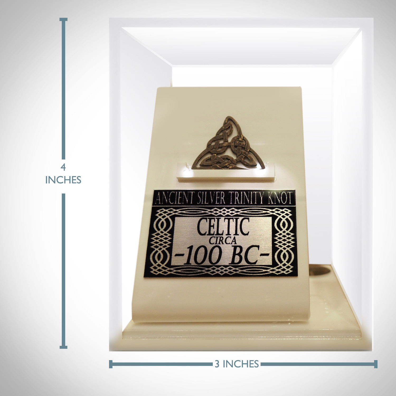 This custom gallery display showcases an ancient Celtic Viking Knot (twister silver) amulet, dating from 100 BC. It's protected under Plexiglass, while allowing you to fully appreciate your collectible piece of ancient history. It also comes with a metal plate explaining the contents within, and a certificate of authenticity. Unique and rare, you will be getting the exact piece shown in the pictures. This piece is an investment that will only get better with age.