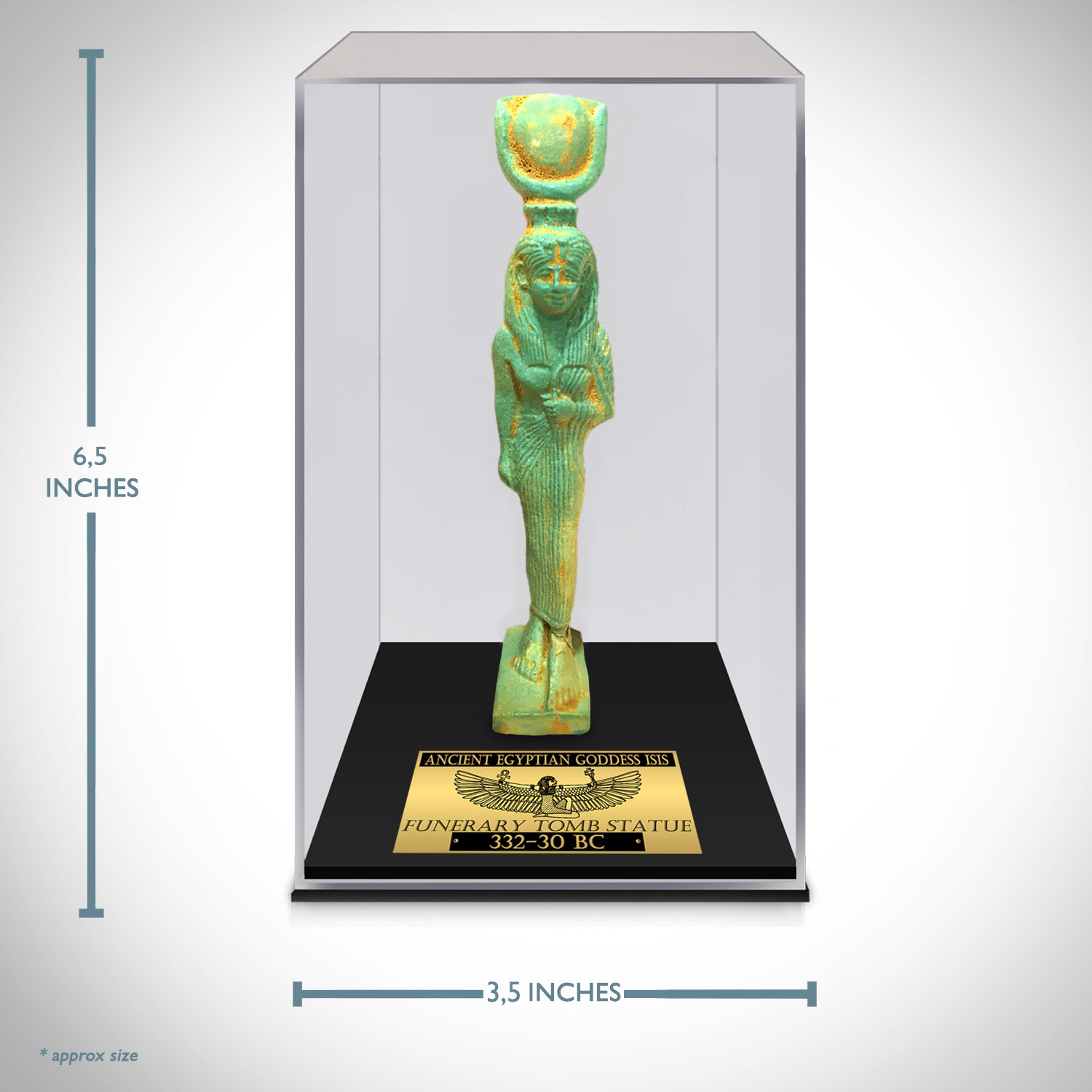 This custom museum display showcases an absolute masterpiece, an authentic Carved Isis Tomb Statue dating from the Ptolemaic Period 332–30 B.C. This statue was finely carved depicting a female in human form with tripartite wig and wearing Hathor's headdress (The preeminent goddess of earlier times), a sun disk between the horns of a cow. The face is beautifully defined with incised mouth, large almond shaped eyes and faint ears. It also has shallow dorsal pillar at back. In her left hand is a flail (attributes of the deity Osiris that became insignia of pharaonic authority), the ancient Egyptian symbol for fertility.