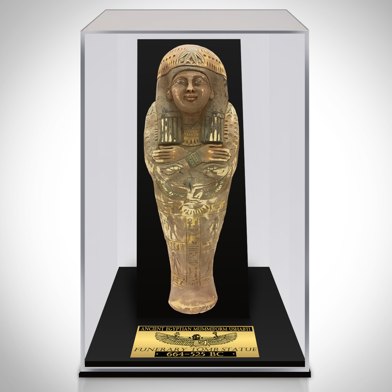 This custom museum display showcases an authentic, oversized XL Carved Ushabti Tomb Statue dating from 664-525 BC, part of the 26th Dynasty. This ancient Egyptian painted tomb statue is finely carved in mummiform, wearing a tripartite wig and broad collar necklace.
