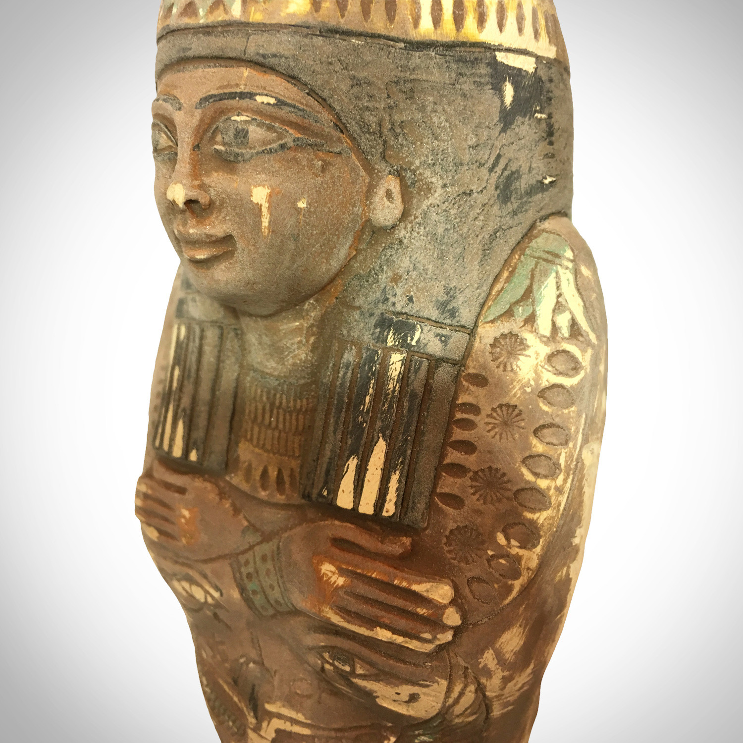 The face is beautifully defined with incised mouth, large almond shaped eyes and faint ears. The arms are crossed on the chest. Bands of carved hieroglyphic inscriptions cover the lower chest and legs (usually a passage from the Book of the Dead), 2 eyes of Horus ( an ancient symbol of protection in the afterlife and to ward off evil), as well as a finely carved winged Goddess Isis depicted in human.