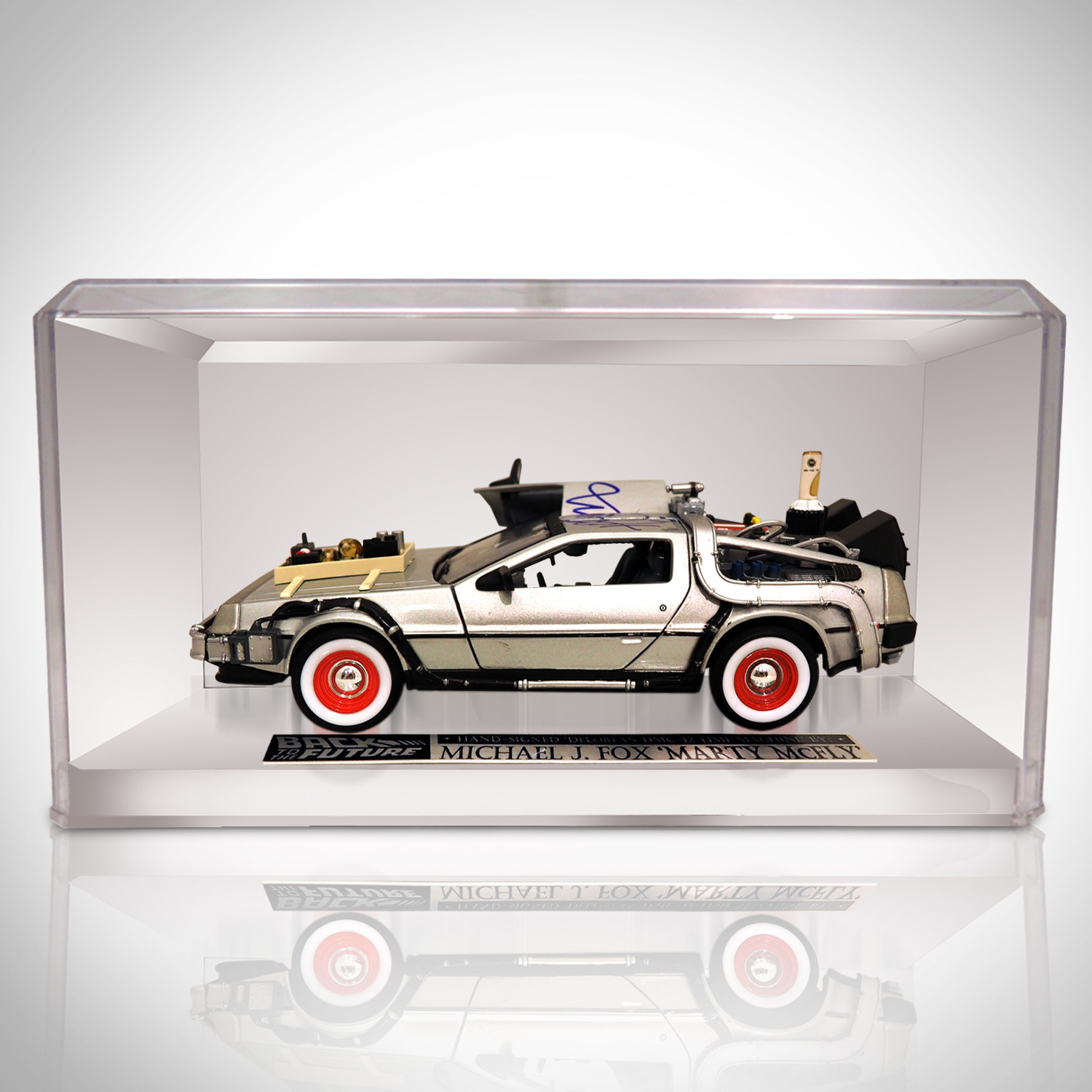 Showcase your love for Back to The Future 3 with this Delorean 1/24 die-cast car, hand-signed by actor Michael J. Fox. Protected under plexiglass in a luxury custom display to keep it looking pristine, ensuring protection of your investment while allowing you to fully appreciate this piece of collectible movie history. The customized descriptive metallic plaque, in addition to the detailed finishing add to the elegant, gallery quality look. Complete with a certificate of authenticity, this piece is an investment that will only get better with age. It's the perfect addition to your prestigious and unique decor.