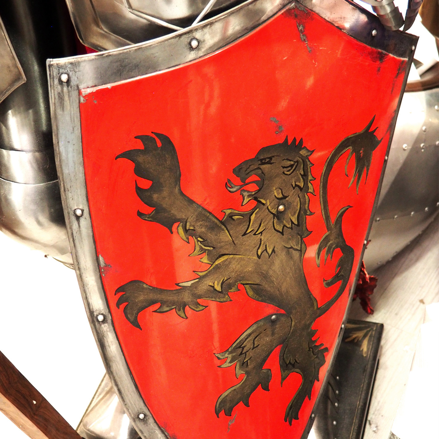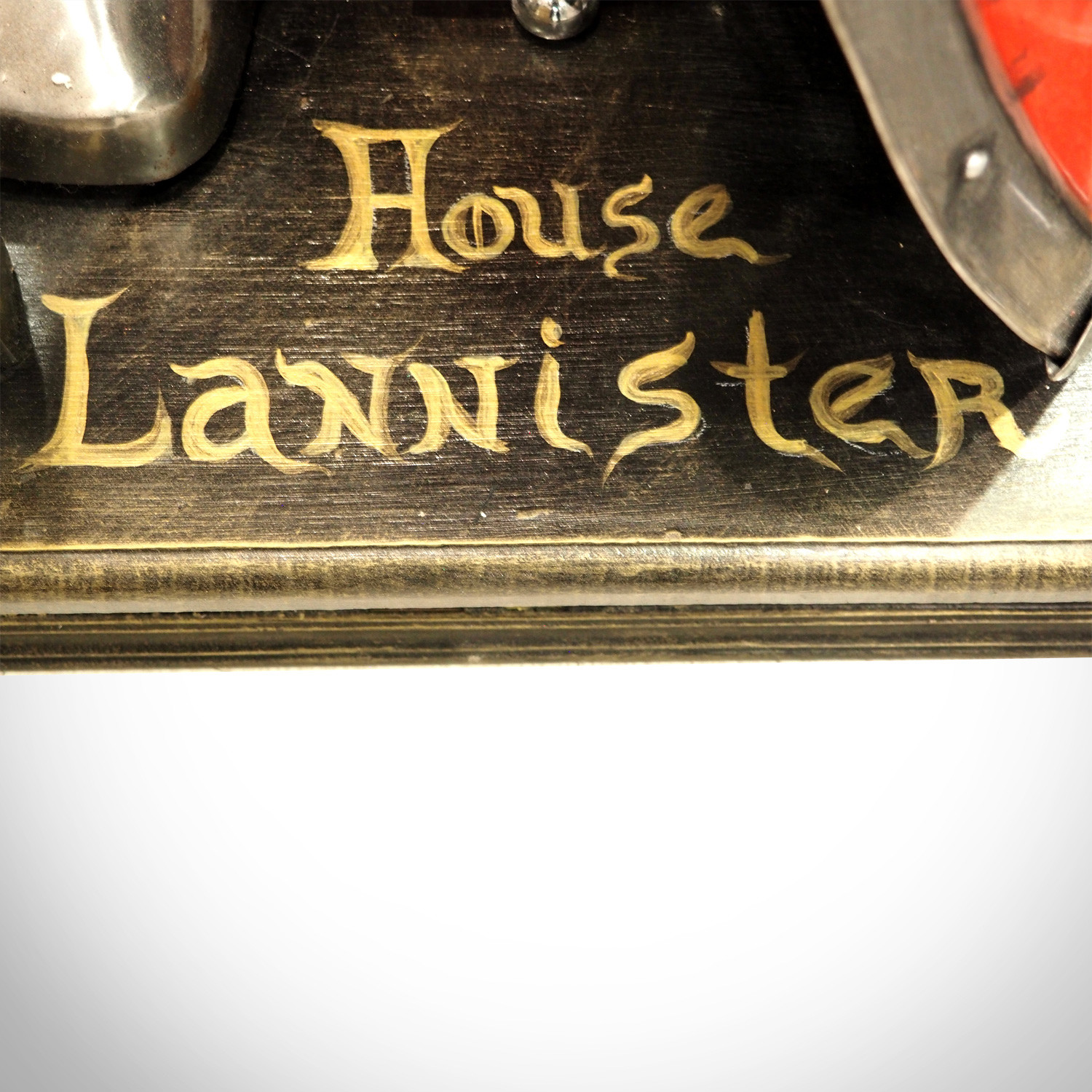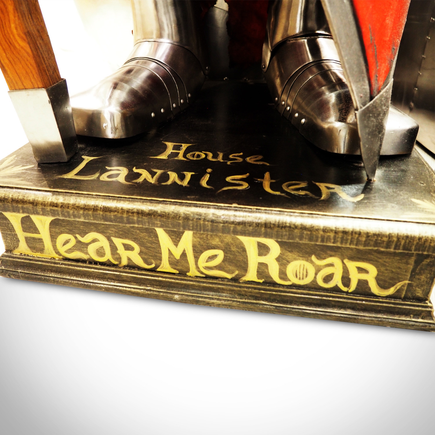 Pay homage to to one of the most iconic and influential TV shows of all times, Game Of Thrones, with this stunning, metal Life Size House Armor Prop which is handmade in a combat design that includes the shield of House Lannister of Casterly Rock, one of the Great Houses of Westeros, one of its richest and most powerful families and oldest dynasties. It is also the current royal house of the Seven Kingdoms. Complete with the impressive spear and helmet, this amazing masterpiece stands proudly at 7 feet, 8 inches tall, on a House of Lannister pedestal, which, like the shield, has been hand painted in Canada with an incredible layering technique that gives it a beautiful texture. Complete with a certificate of authenticity from the artist. This is truly the crown jewel of any collection and a breathtaking addition to your prestigious decor. It's so unique and rare, you will be getting the exact piece shown in the pictures.