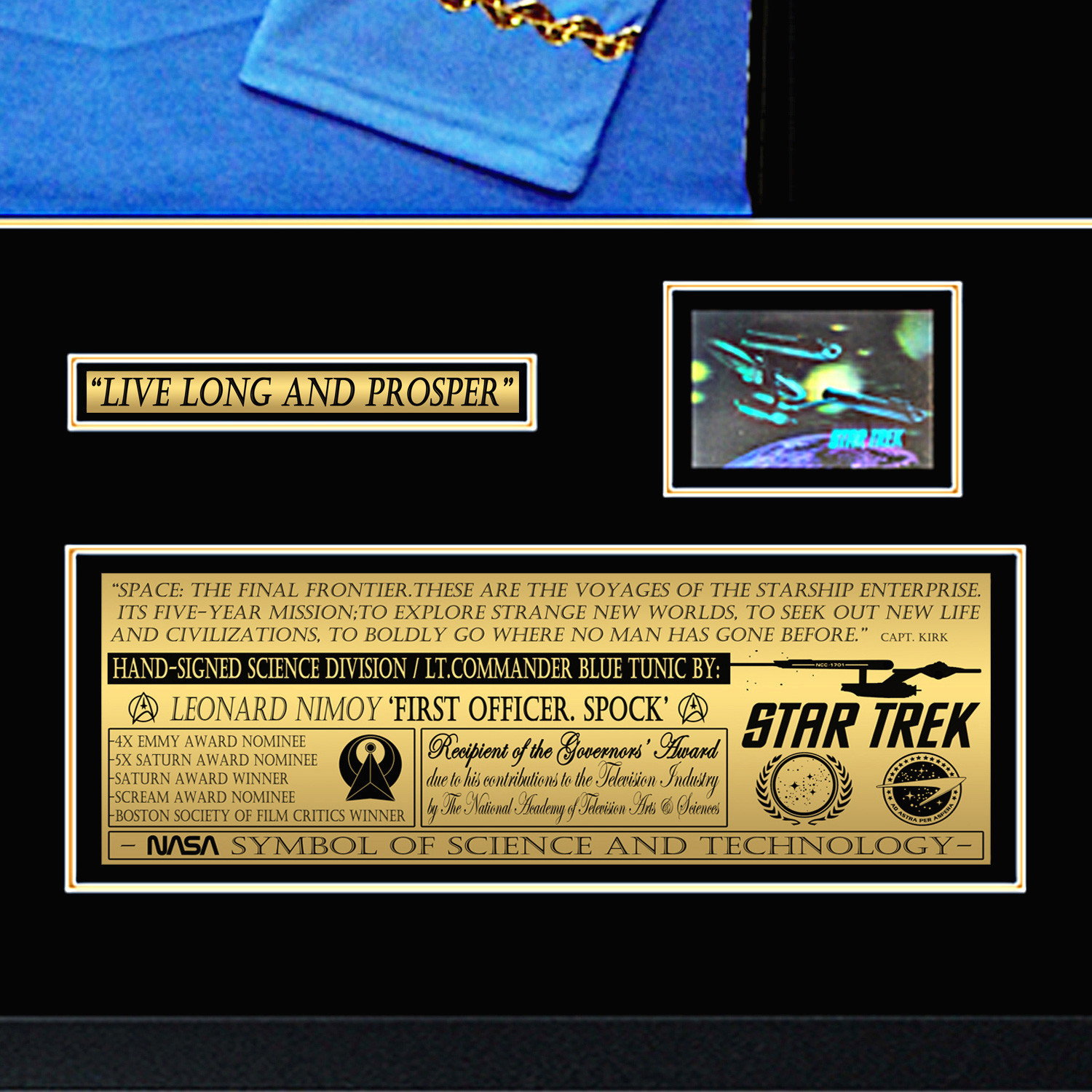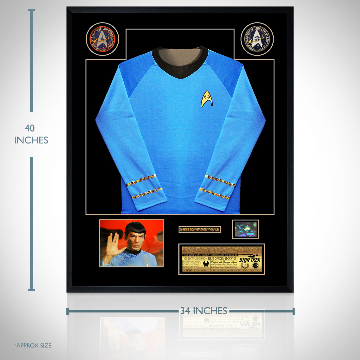 Pay homage to one of the most iconic and influential TV shows of all times, Star Trek, with this absolute masterpiece, a gallery-framed shadow box custom made display, featuring a Starfleet uniform and a hand-signed photo by Spock himself, the late, great Leonard Nimoy. The double matted display is mounted in a high-quality wood frame and finished with protective quality glass to keep it looking pristine. The customized descriptive metallic plaque, the Star Trek corner patches, in addition to the detailed finishing and openings, add to the elegant and sophisticated gallery quality look. Complete with a certificate of authenticity and verifiable numbered hologram, this piece is an exciting investment that will only get better with age.