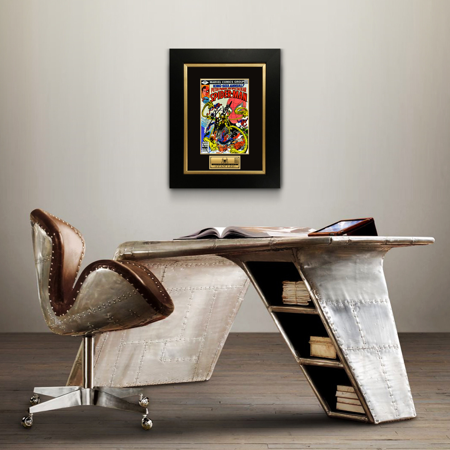 Showcase your love for Spiderman with this gallery framed display, featuring a Peter Parker The Spectacular Spiderman # 1 comic book hand signed by Marvel Co-Founder Stan Lee. The double matted display is mounted in a high-quality wood frame and finished with protective glass to keep it looking pristine. The customized descriptive metallic plaque, in addition to the detailed finishing and openings, add to the elegant, gallery quality look. Complete with a certificate of authenticity, it’s the perfect addition to any prestigious collection.
