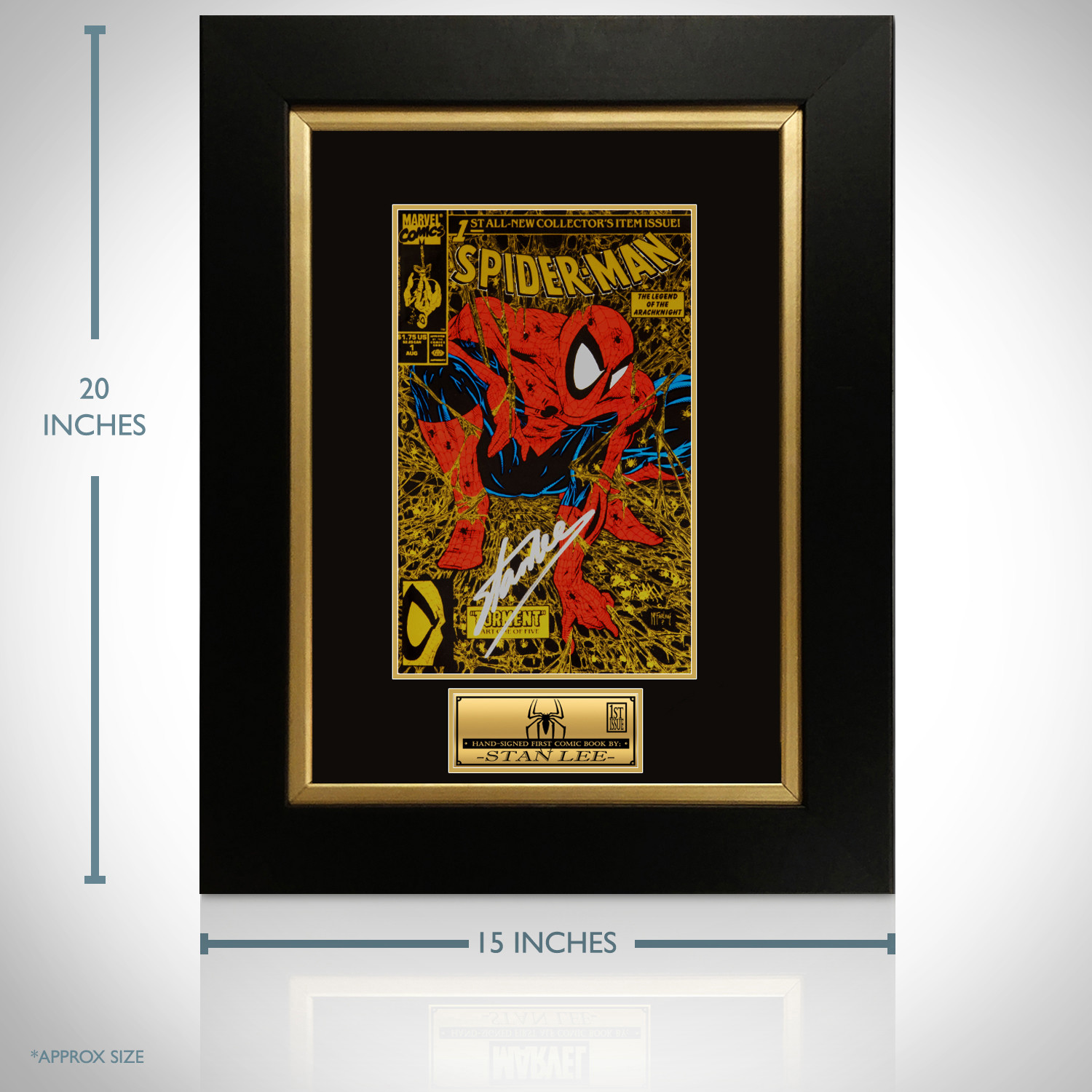 Showcase your love for Spiderman with this gallery framed display, featuring a Spiderman Torment # 1 comic book hand signed by Marvel Co-Founder Stan Lee. The double matted display is mounted in a high-quality wood frame and finished with protective glass to keep it looking pristine. The customized descriptive metallic plaque, in addition to the detailed finishing and openings, add to the elegant, gallery quality look. Complete with a certificate of authenticity, it’s the perfect addition to any prestigious collection.