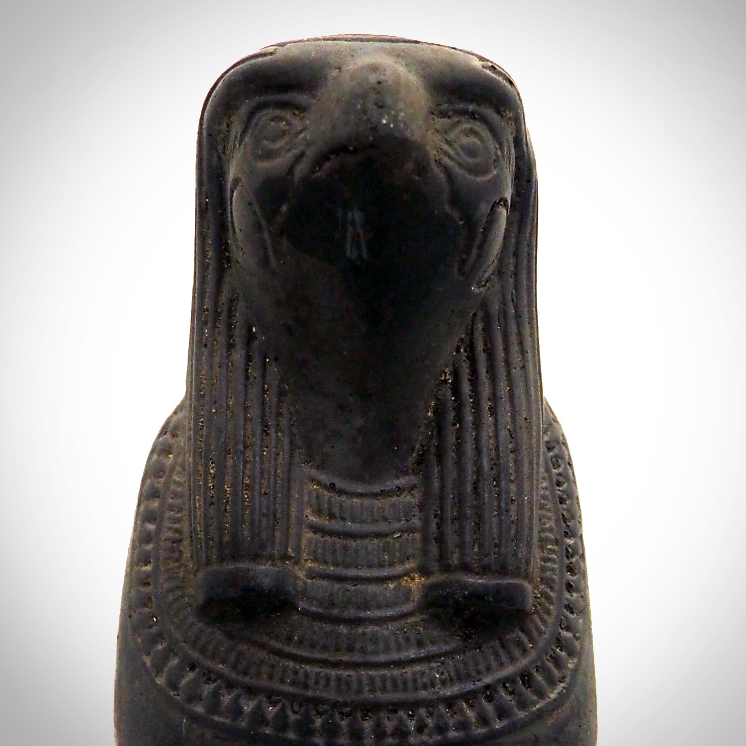 Horus served many functions, most notably being a god of kingship and the sky. This statue was finely carved in mummiform, wearing a tripartite wig and broad collar necklace. The Falcon head is also beautifully defined. Ushabti figures were placed in ancient Egyptian tombs in order to serve the deceased in the afterlife.
