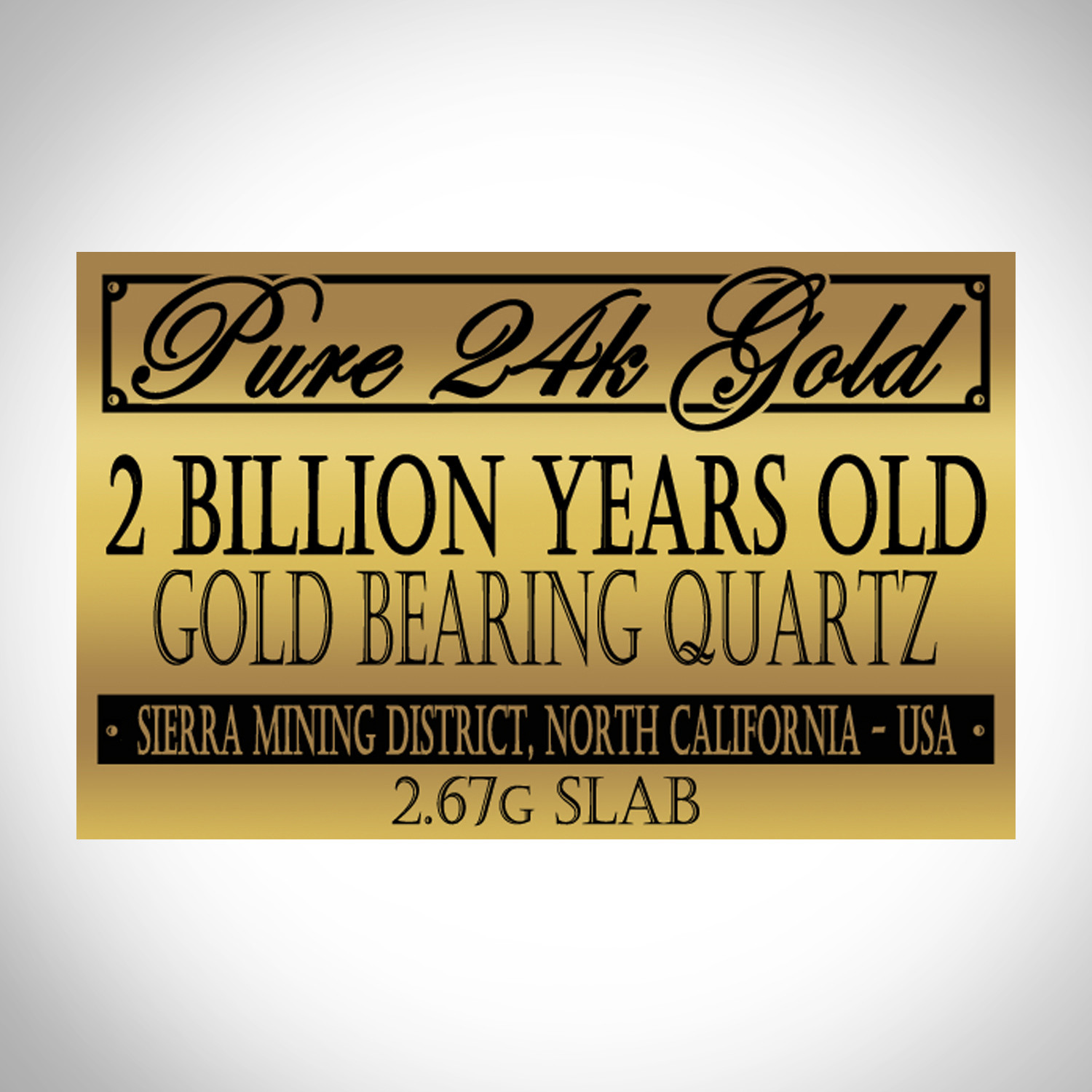This custom museum display showcases an Authentic 2.67 gram pure gold bearing quartz which was found in the Sierra Mining District of Northern California. The gold was formed in quartz deposits such as this, and only if/when erosion took place, veins of gold would break out into the rivers and form individual gold nuggets or gold flake. The gold still left in the quartz is now referred to as 'gold bearing quartz', or 'gold lode' by ol'time prospectors.