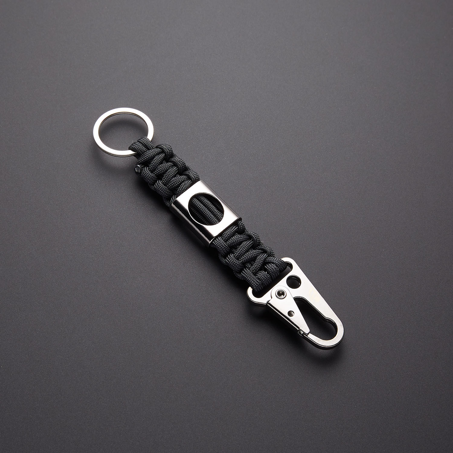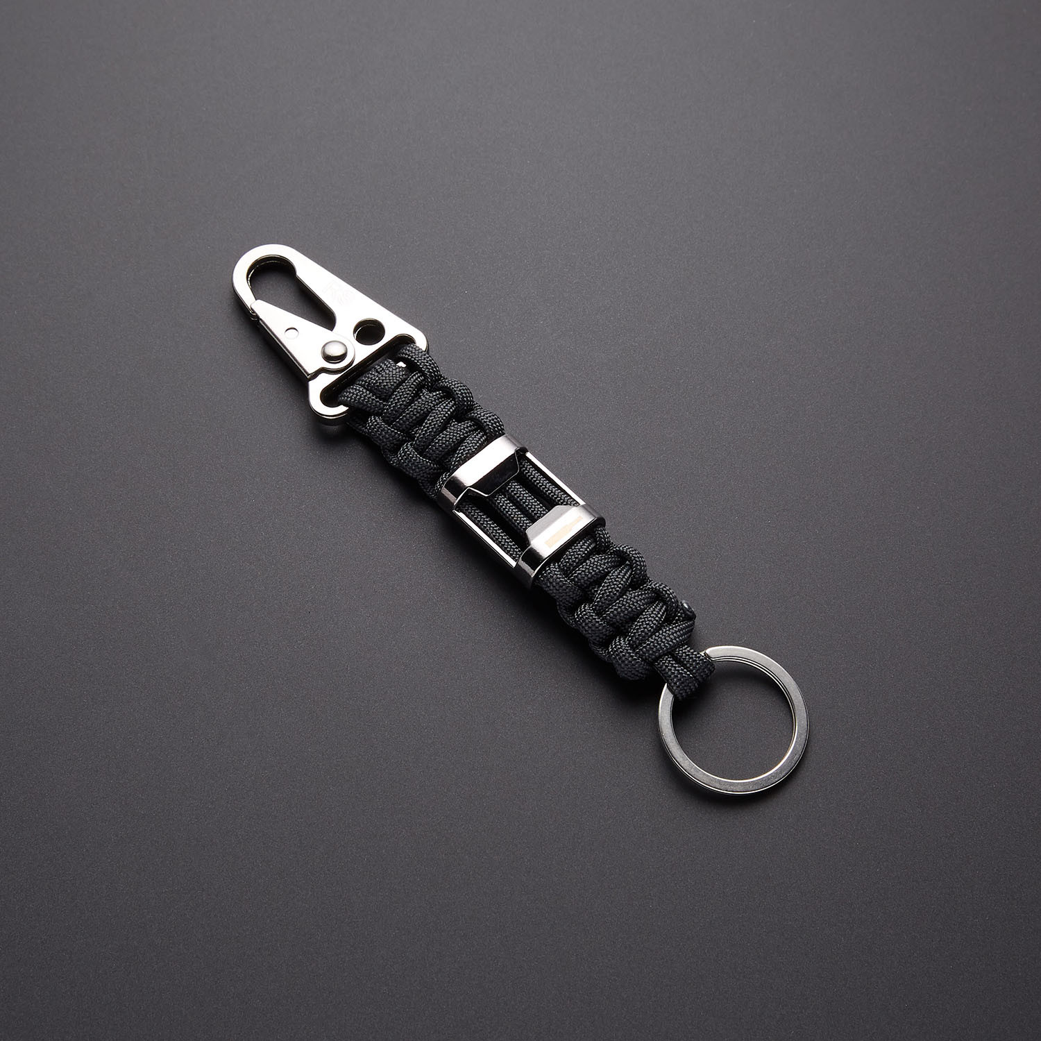 The paracord test strength is 550lbs static. For working strength and dynamic lifting, it's about 150lbs. The length in a keychain is about 5 feet.