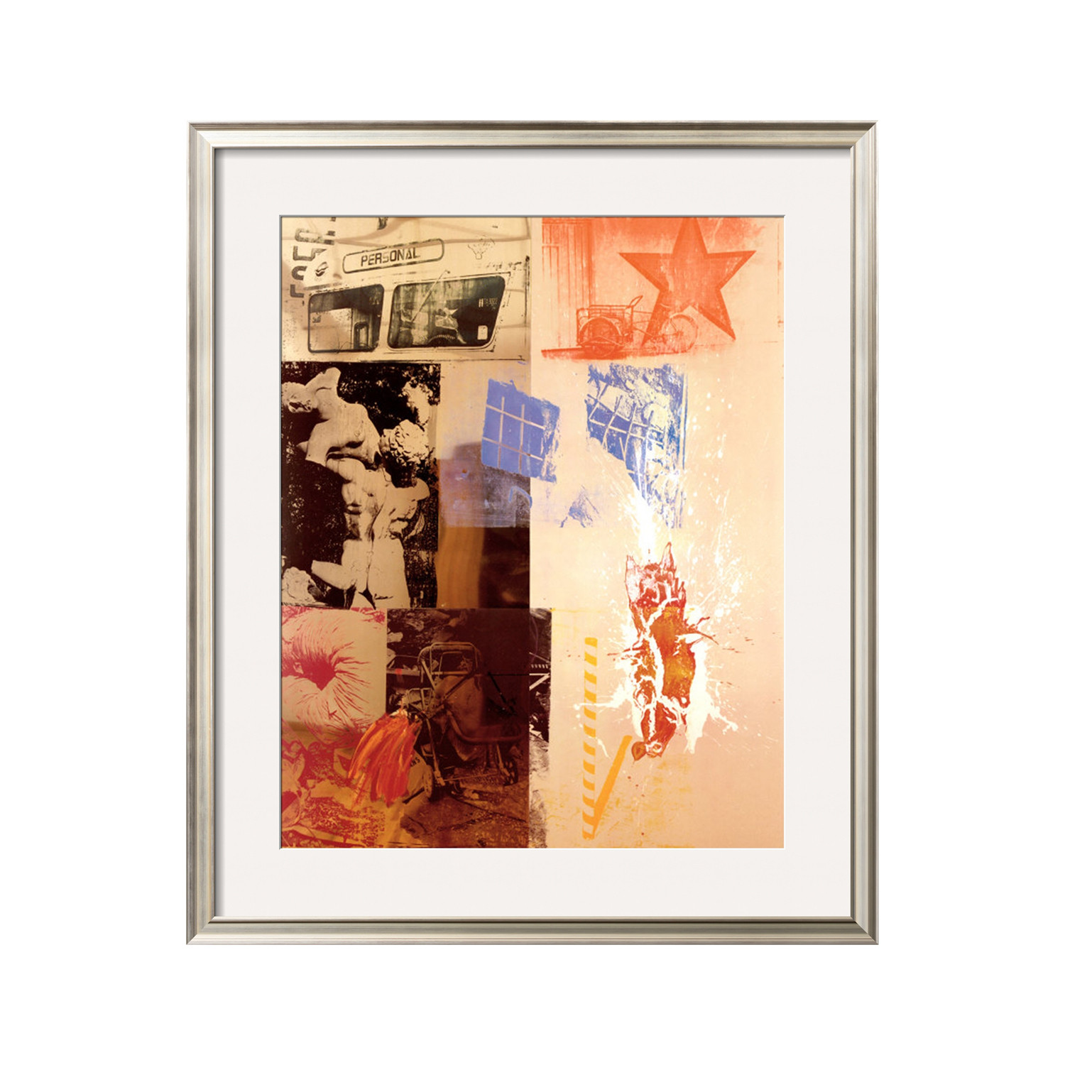 This framed print is both lovely and evocative with a combination of found elements and personal embellishments. Rauschenberg was ever-analytical of consumer culture and the world around him—this print is a sweeping interpretation of the artist's perspective.