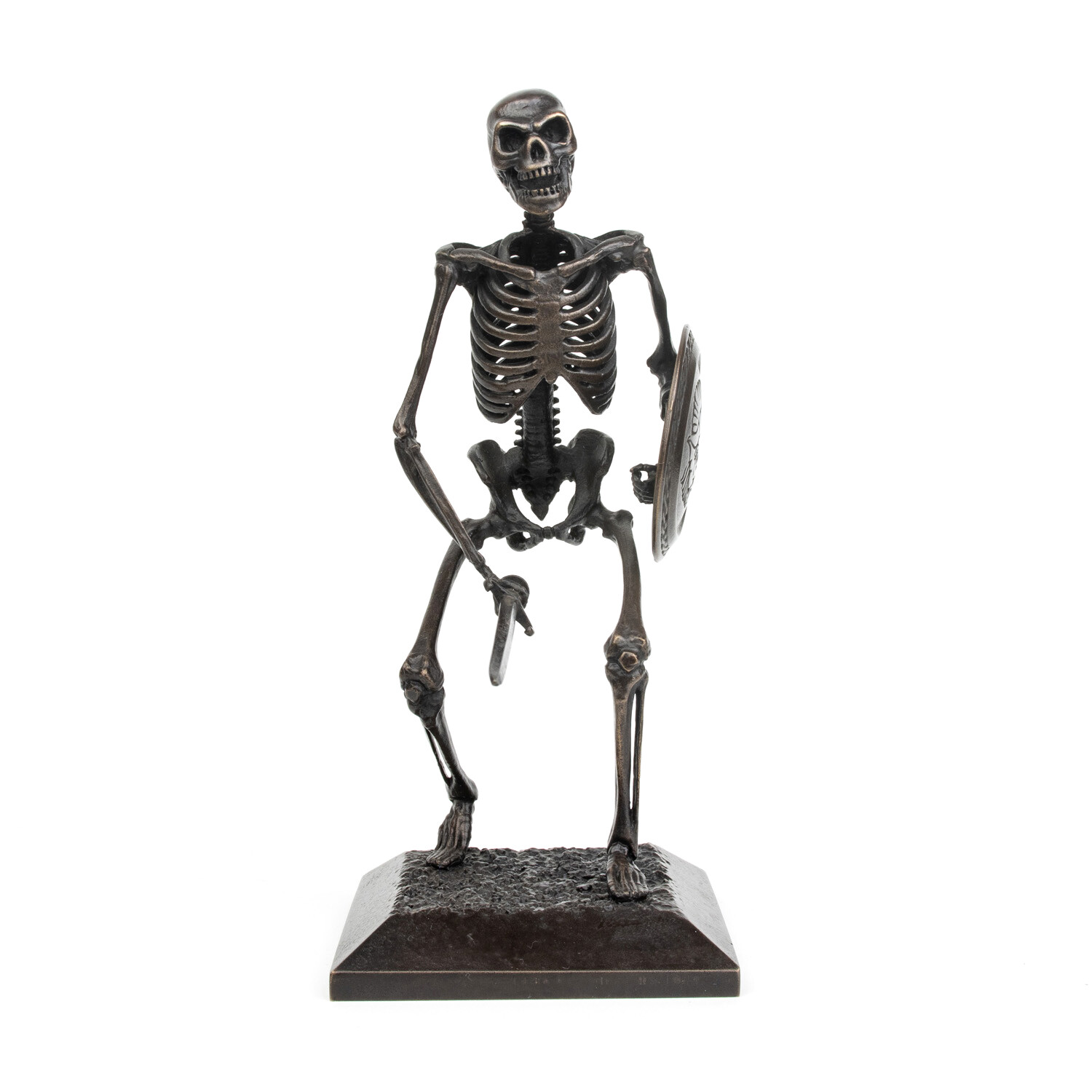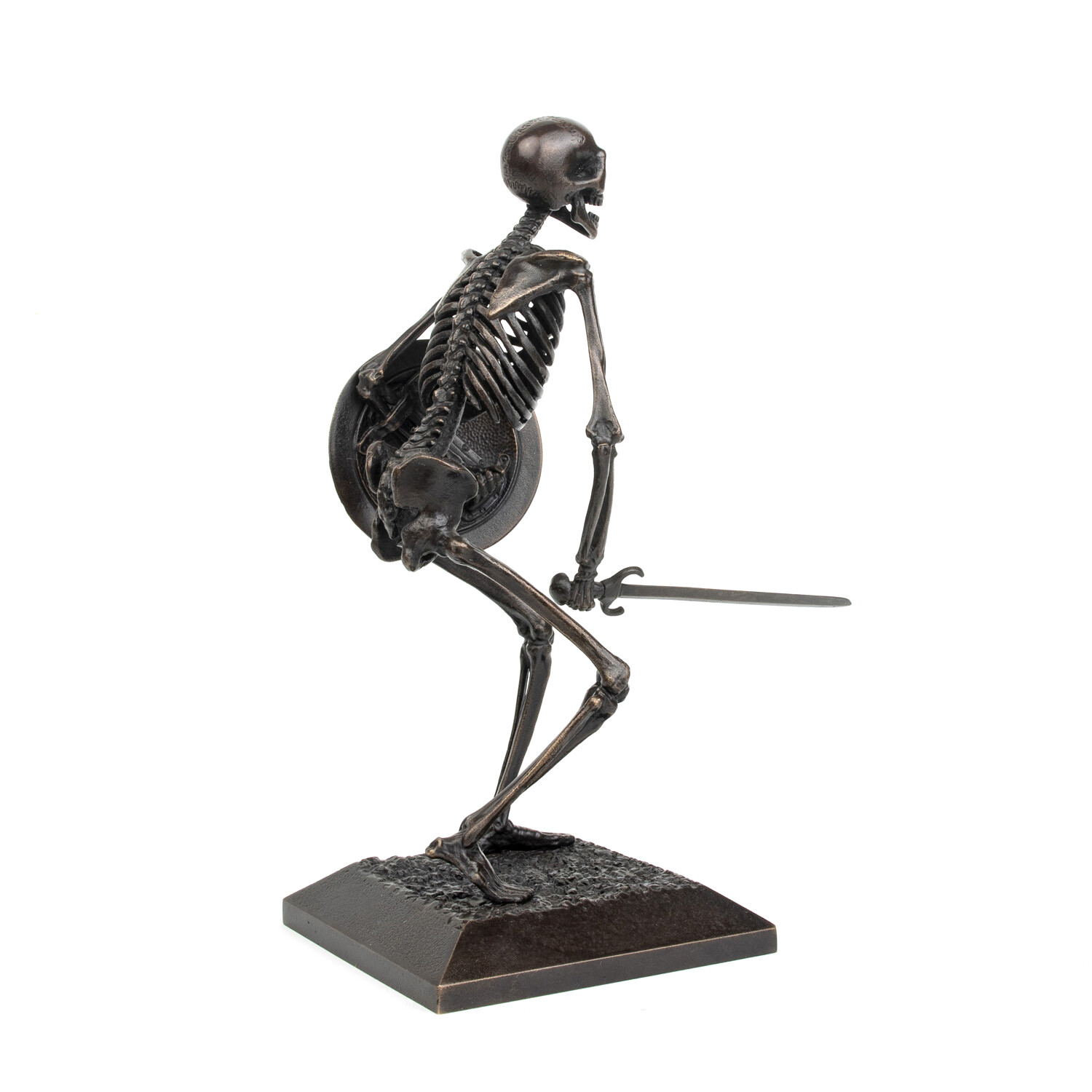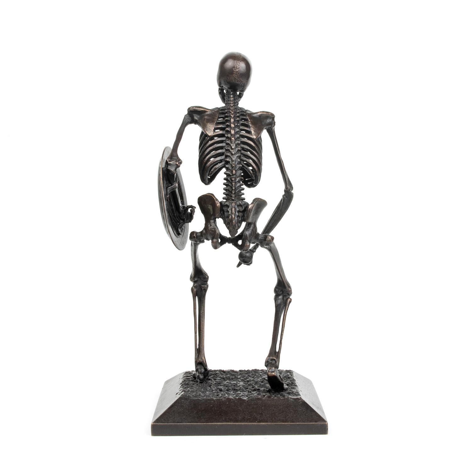The skeletons are approximately one tenth life size and would be seven inches tall if standing upright. Each sculpture is hand-made, carefully assembled bone by bone in wax then lost-wax cast into bronze. This is a Beta skeleton (lion shield) with a darkened bronze finish.