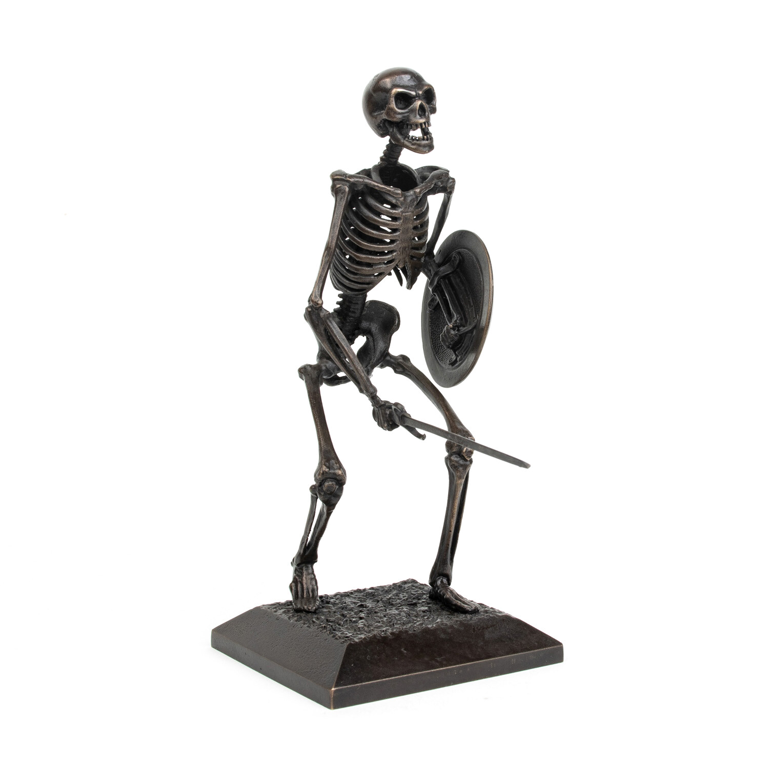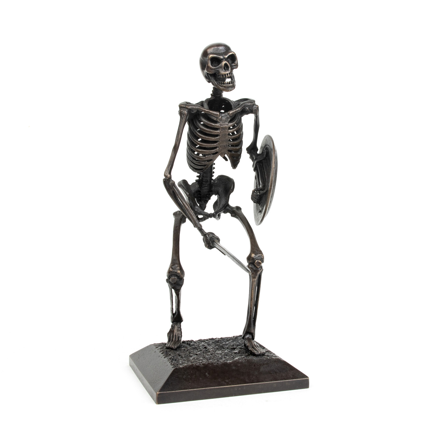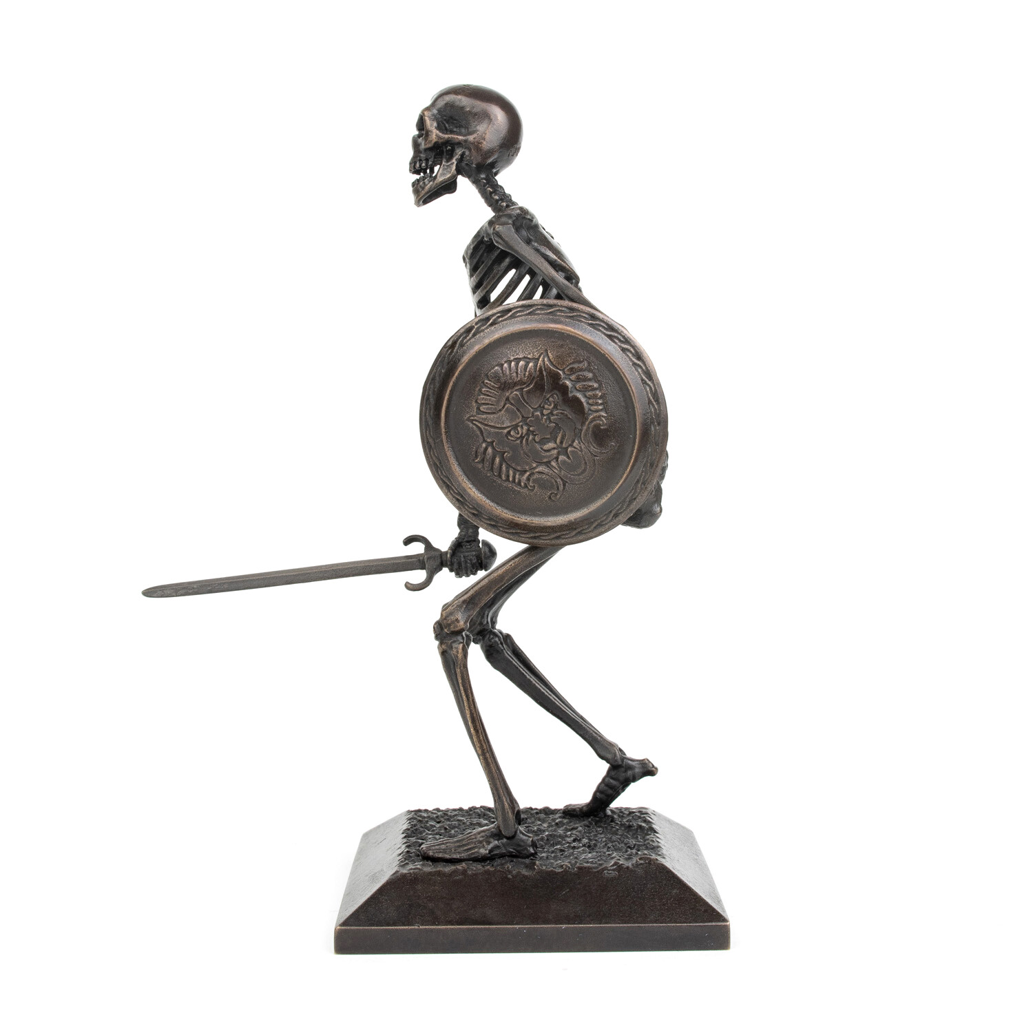 The skeletons are approximately one tenth life size and would be seven inches tall if standing upright. Each sculpture is hand-made, carefully assembled bone by bone in wax then lost-wax cast into bronze. This is a Beta skeleton (lion shield) with a darkened bronze finish.