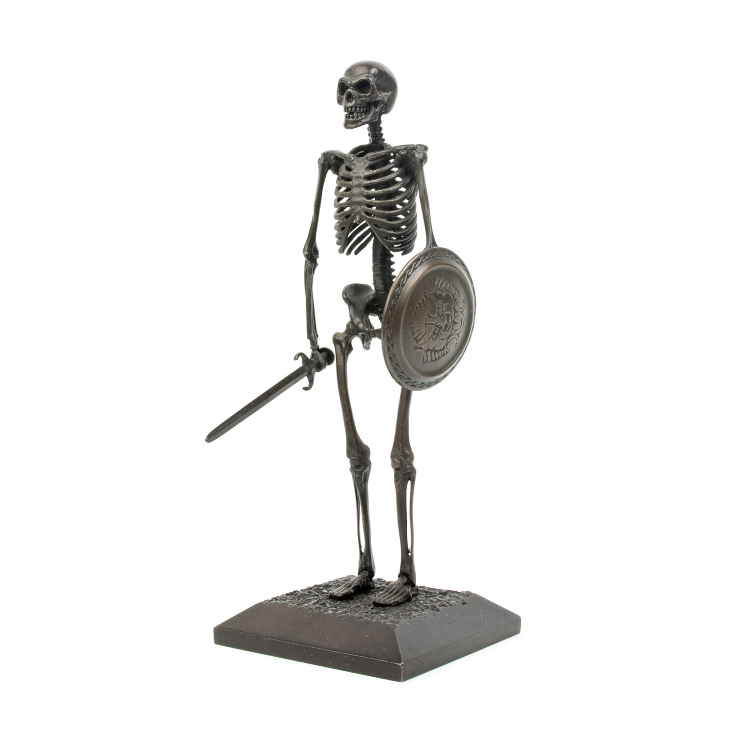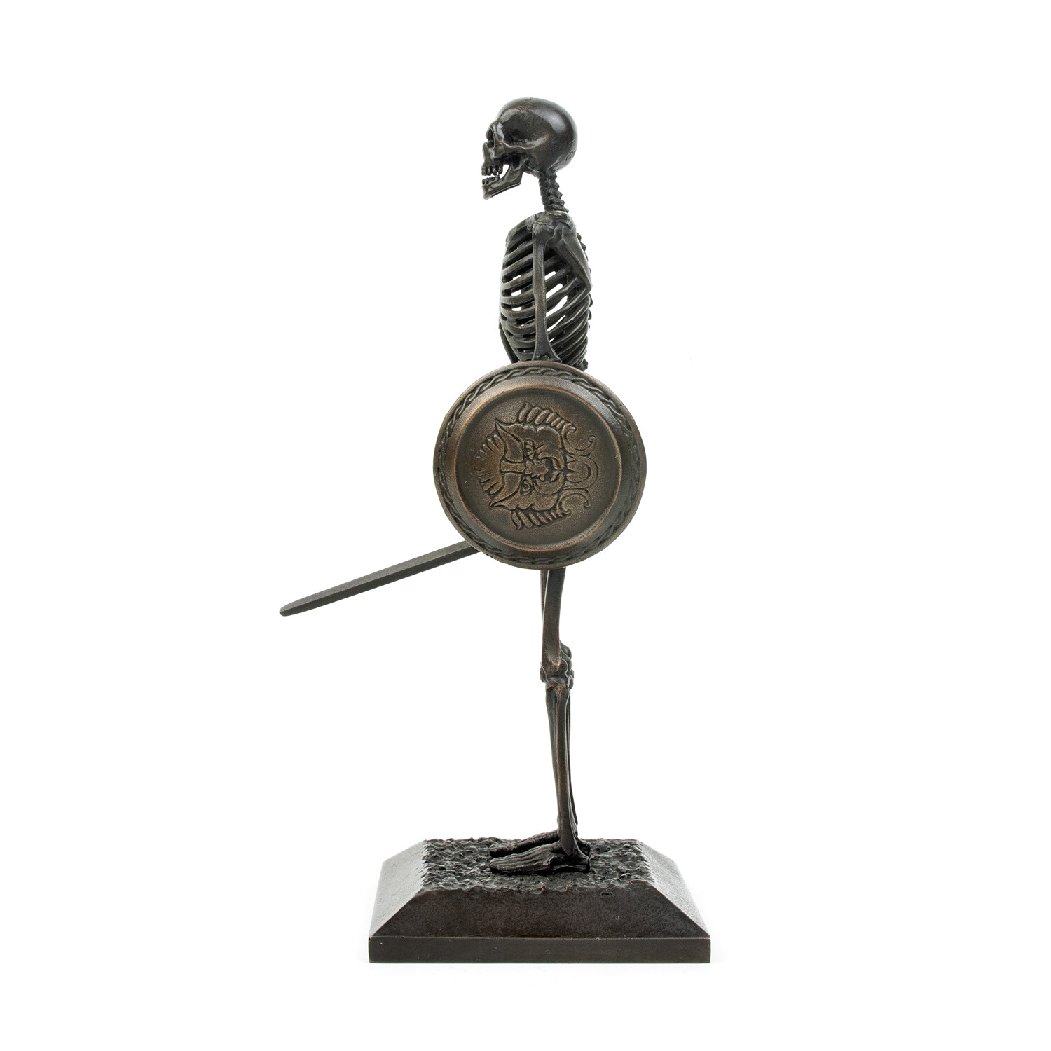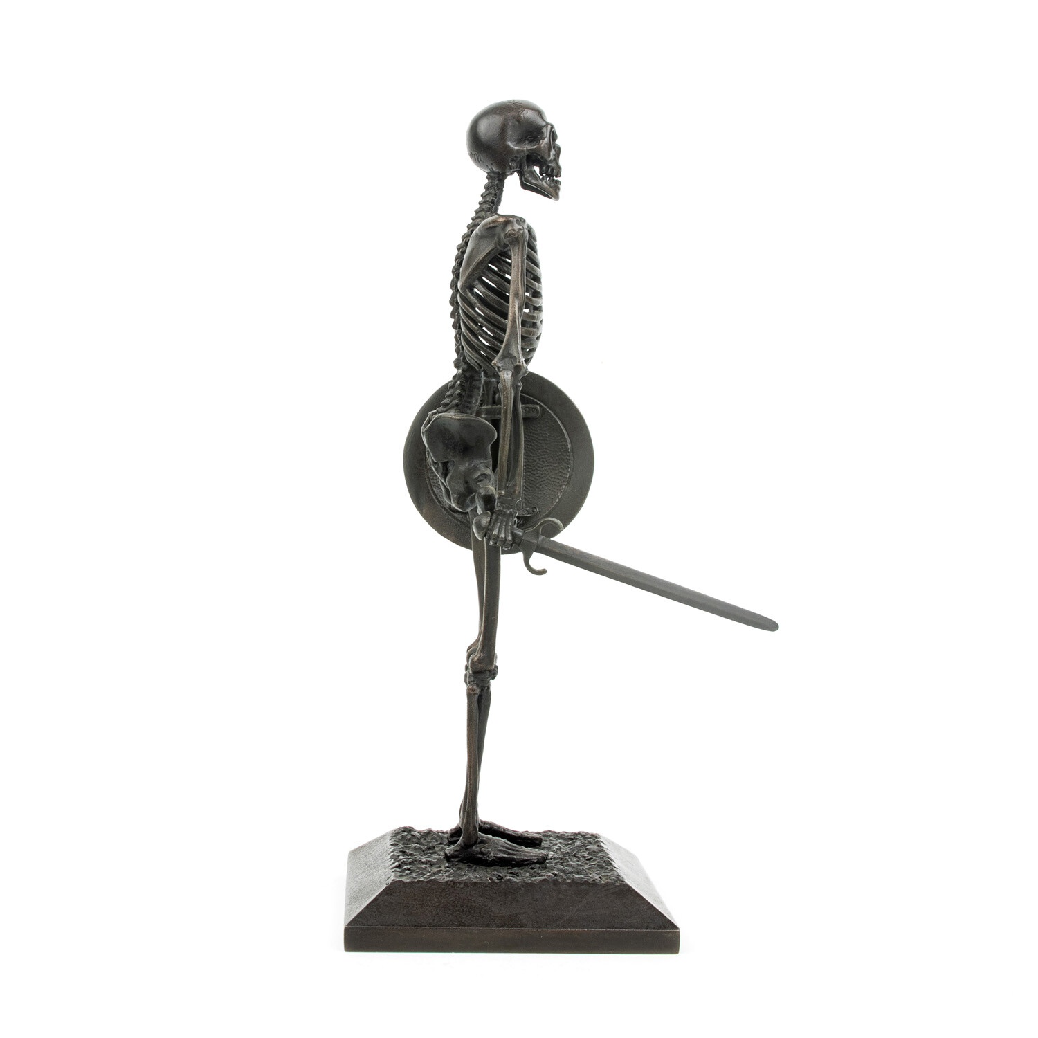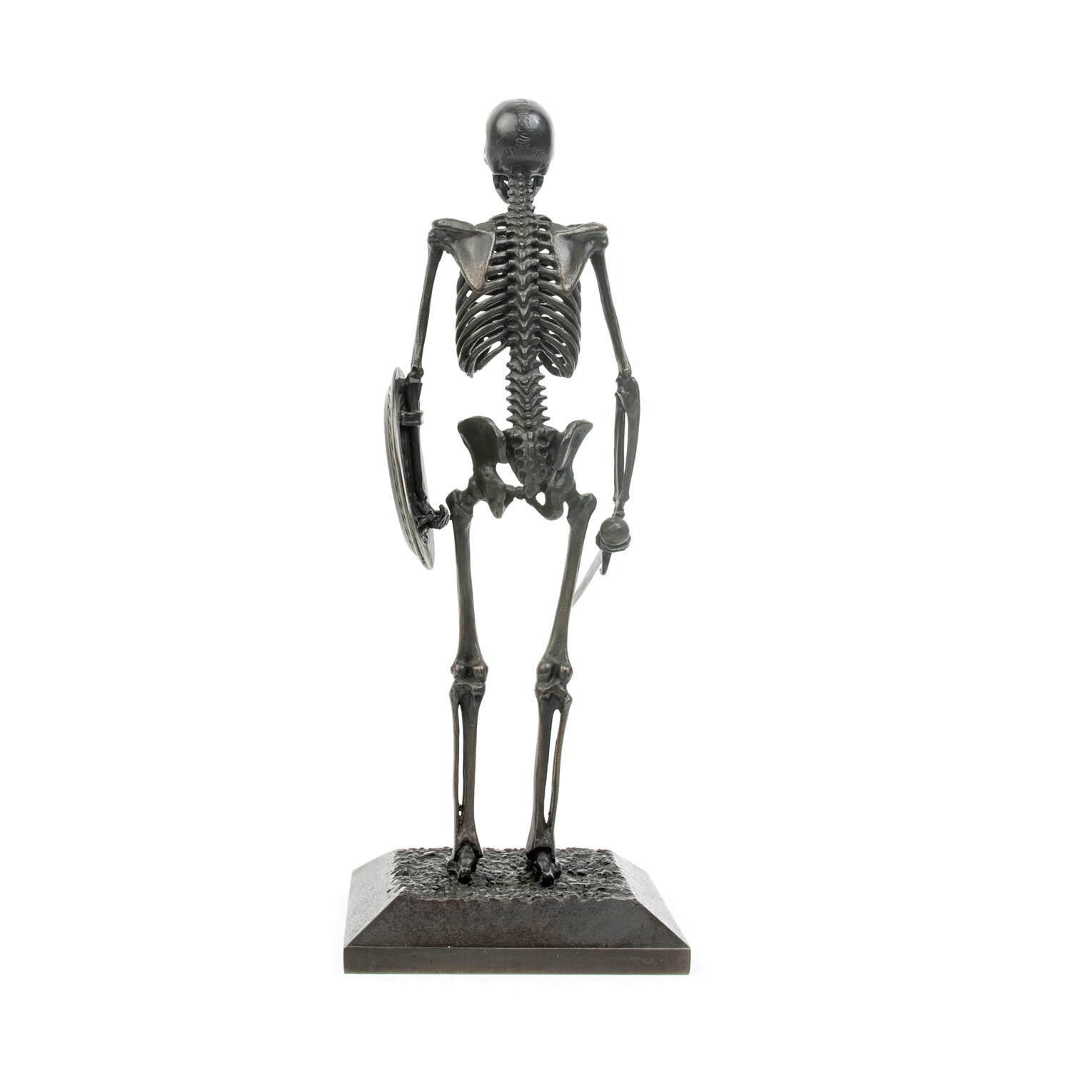The skeletons are approximately one tenth life size and would be seven inches tall if standing upright. Each sculpture is hand-made, carefully assembled bone by bone in wax then lost-wax cast into bronze.
