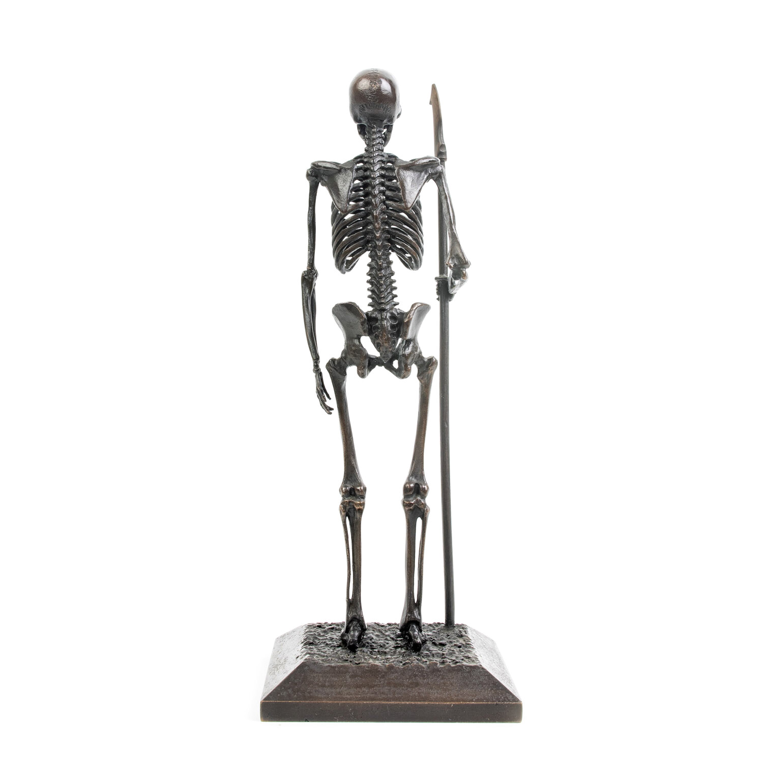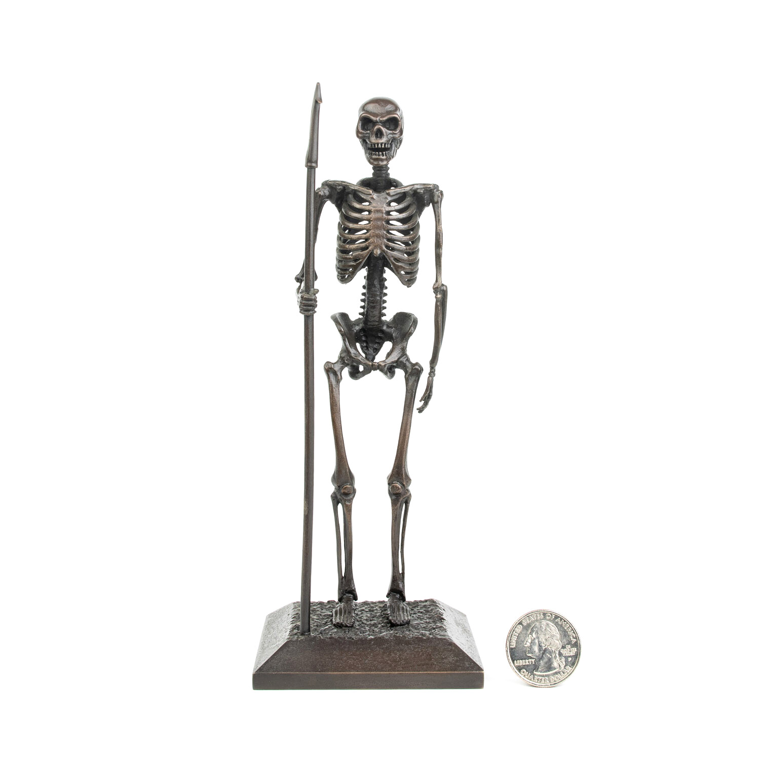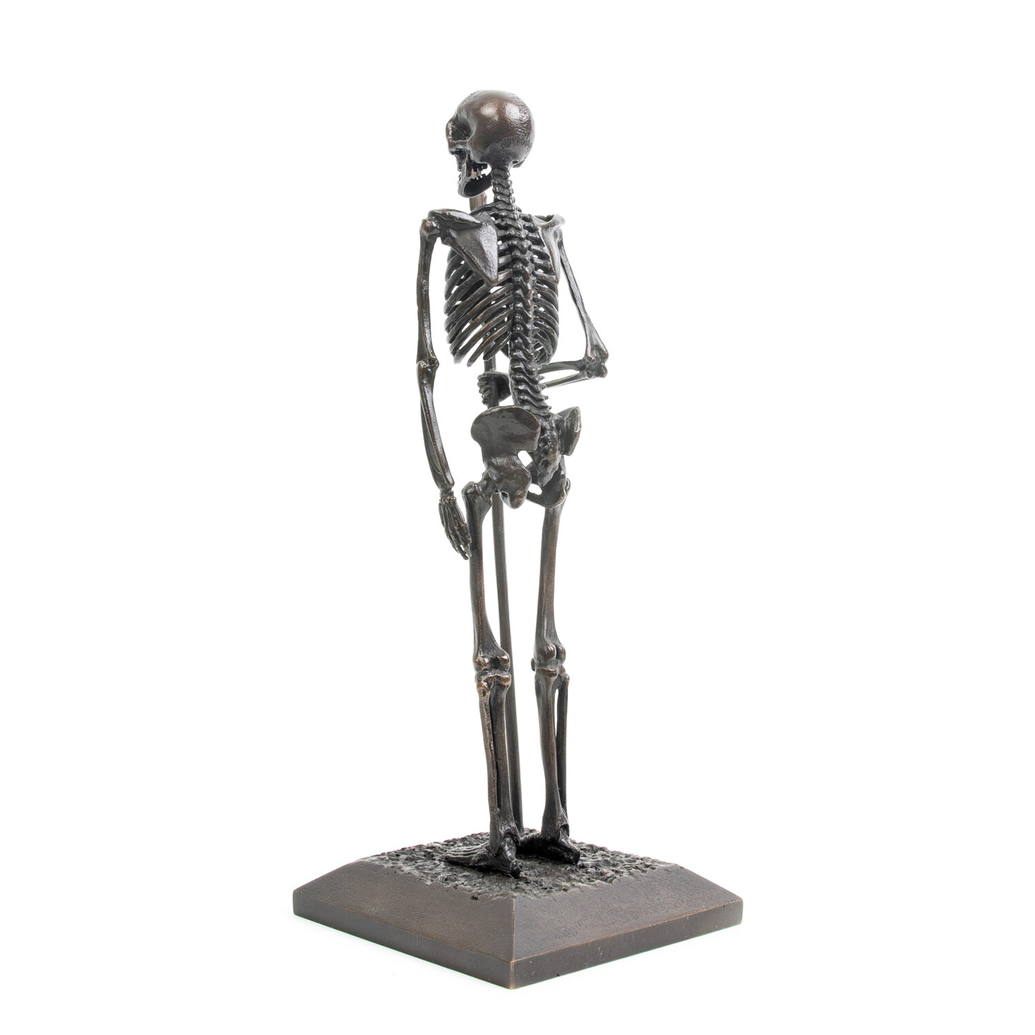The skeletons are approximately one tenth life size and would be seven inches tall if standing upright. Each sculpture is hand-made, carefully assembled bone by bone in wax then lost-wax cast into bronze.