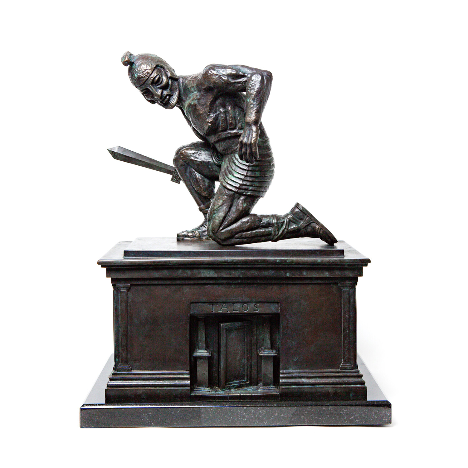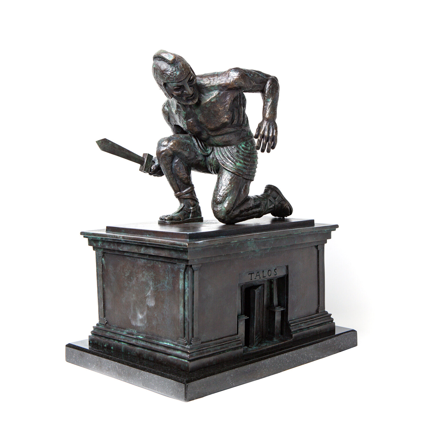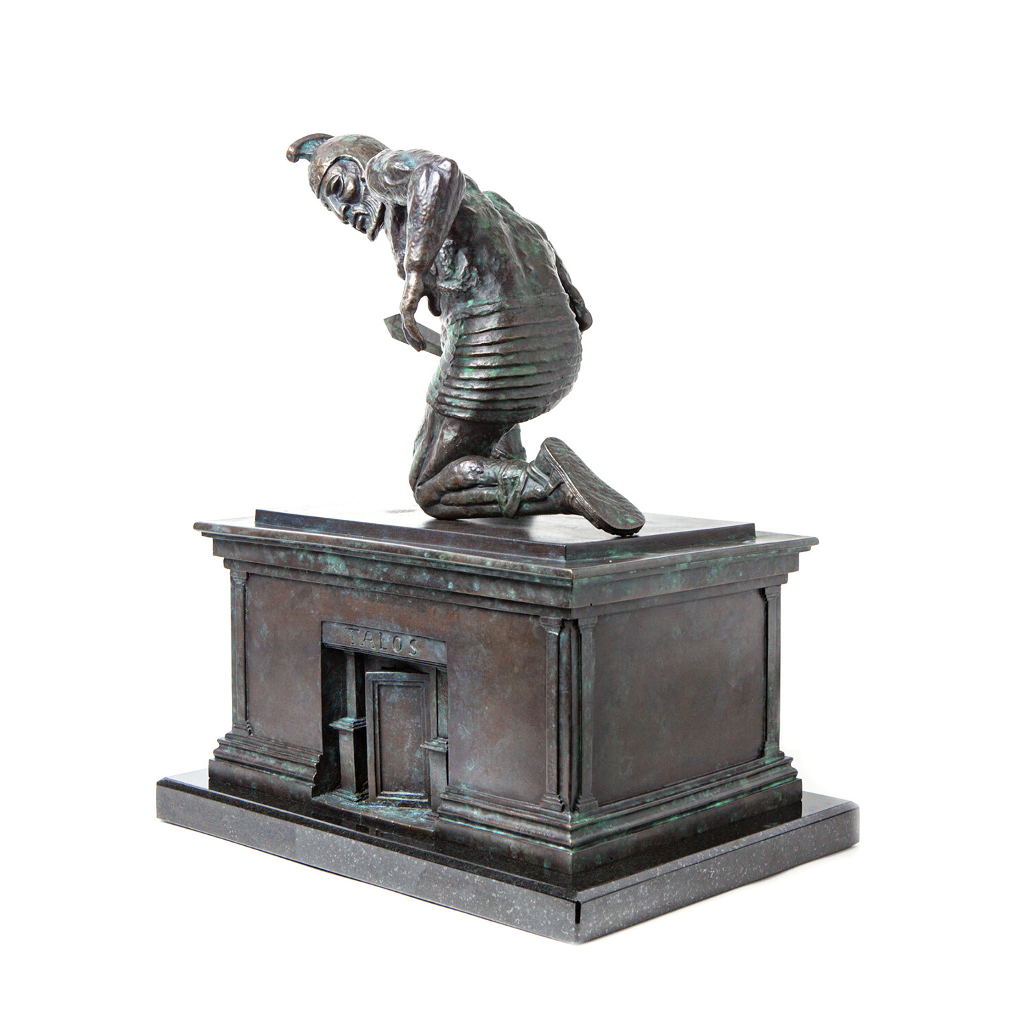 In Talos Awakes, Talos is kneeling on the plinth, head turned, as he was when he first came to life in the 1963 cult classic film Jason and the Argonauts. Ray Harryhausen had started work on this sculpture in the 1990s; he had made the plinth for Talos to kneel on but had not sculpted the figure of Talos. The plinth was loaned to us by the Ray & Diana Harryhausen Foundation to mould, for the figure of Talos we have worked directly from the original model. Talos was first scanned and printed in very high resolution, the 3D print then underwent painstaking restoration. Once restored Talos was carefully repositioned into the iconic stance, with meticulous attention to detail at every stage. The whole process took several years to complete.