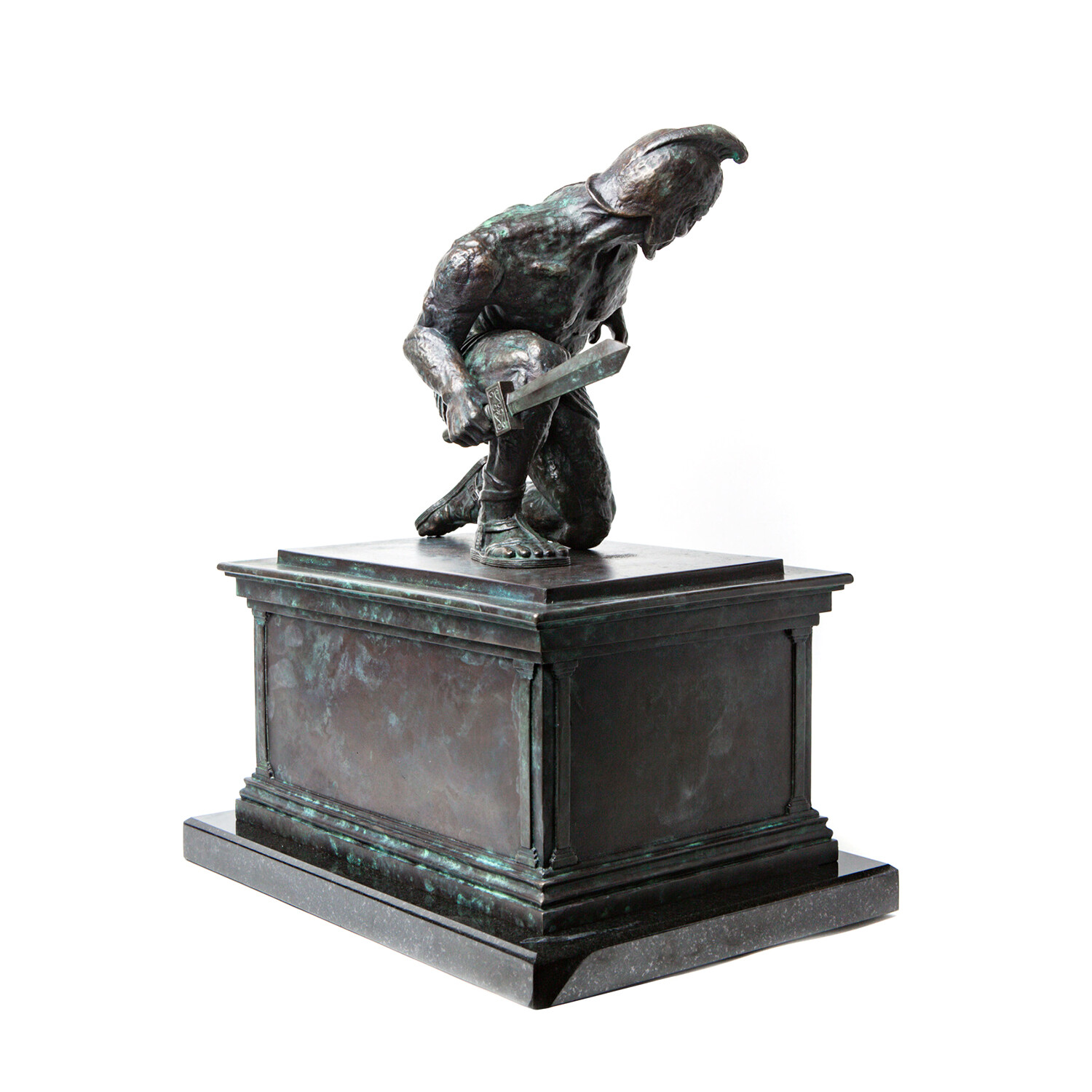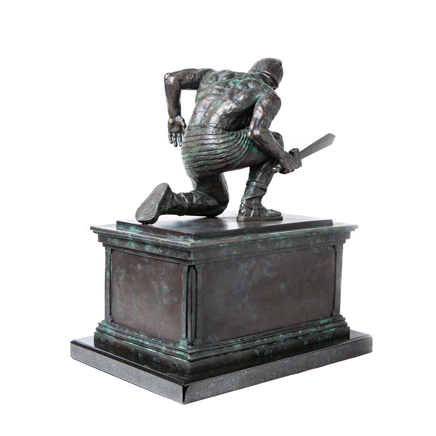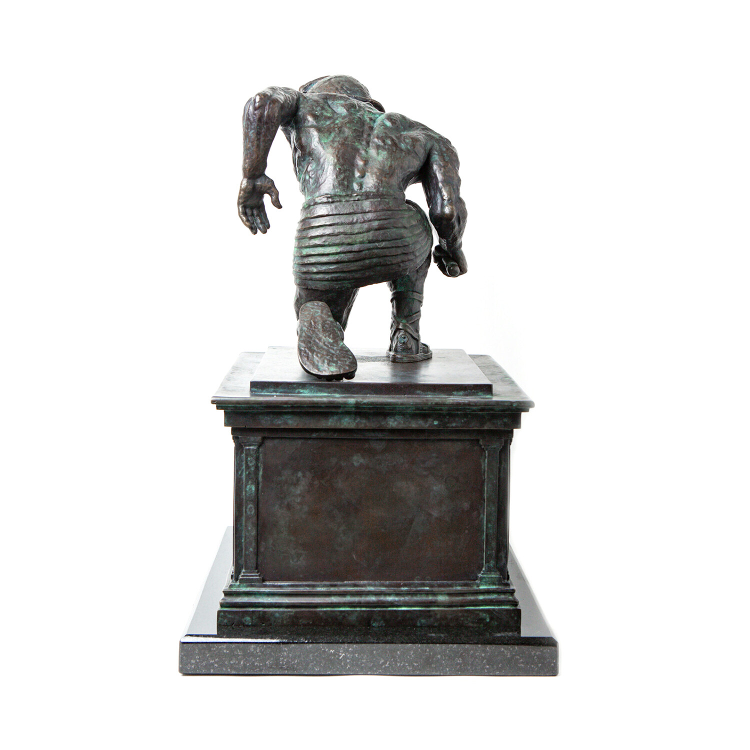 In Talos Awakes, Talos is kneeling on the plinth, head turned, as he was when he first came to life in the 1963 cult classic film Jason and the Argonauts. Ray Harryhausen had started work on this sculpture in the 1990s; he had made the plinth for Talos to kneel on but had not sculpted the figure of Talos. The plinth was loaned to us by the Ray & Diana Harryhausen Foundation to mould, for the figure of Talos we have worked directly from the original model. Talos was first scanned and printed in very high resolution, the 3D print then underwent painstaking restoration. Once restored Talos was carefully repositioned into the iconic stance, with meticulous attention to detail at every stage. The whole process took several years to complete.