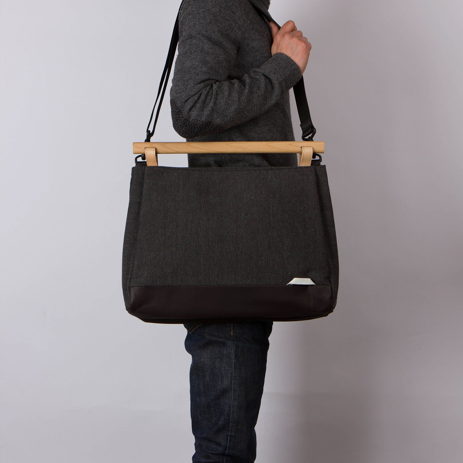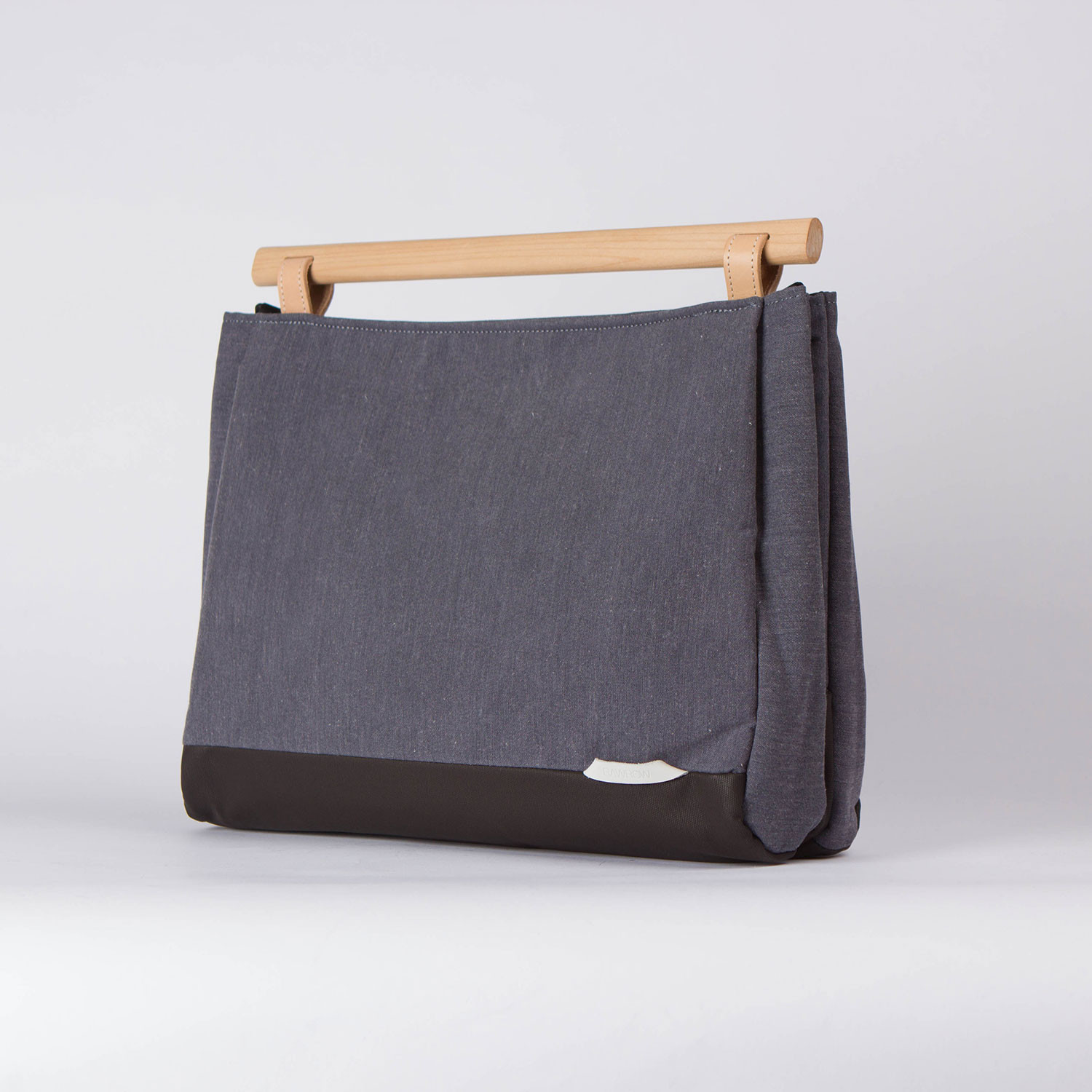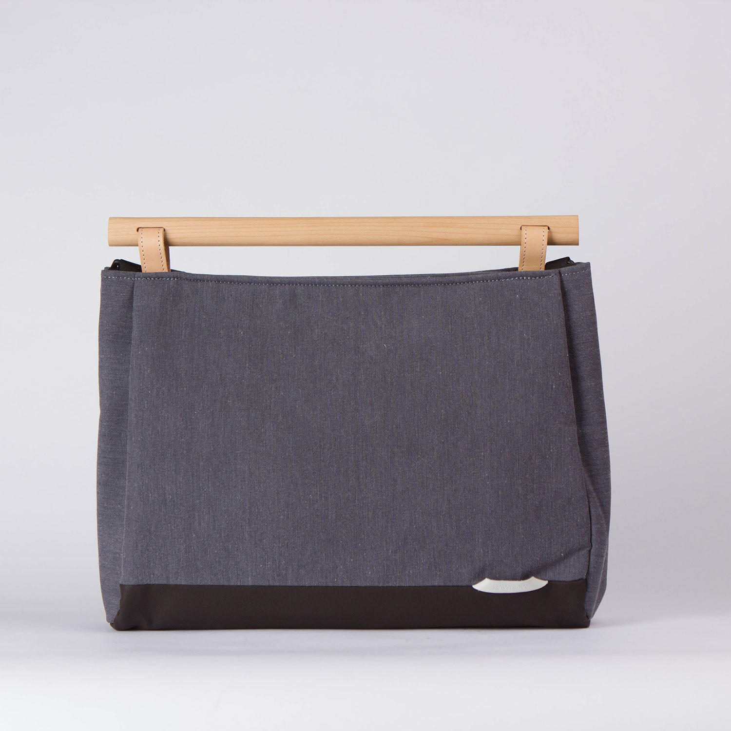 In a waxed chambray fabric that will age and develop characteristics over time and a sturdy and sophisticated maple wood handle, the Sylvan Laptop Shoulder Bag 120 features an easy-insert external pocket for magazines and newspapers and various internal pockets that can hold phones, pens, wallets, etc.