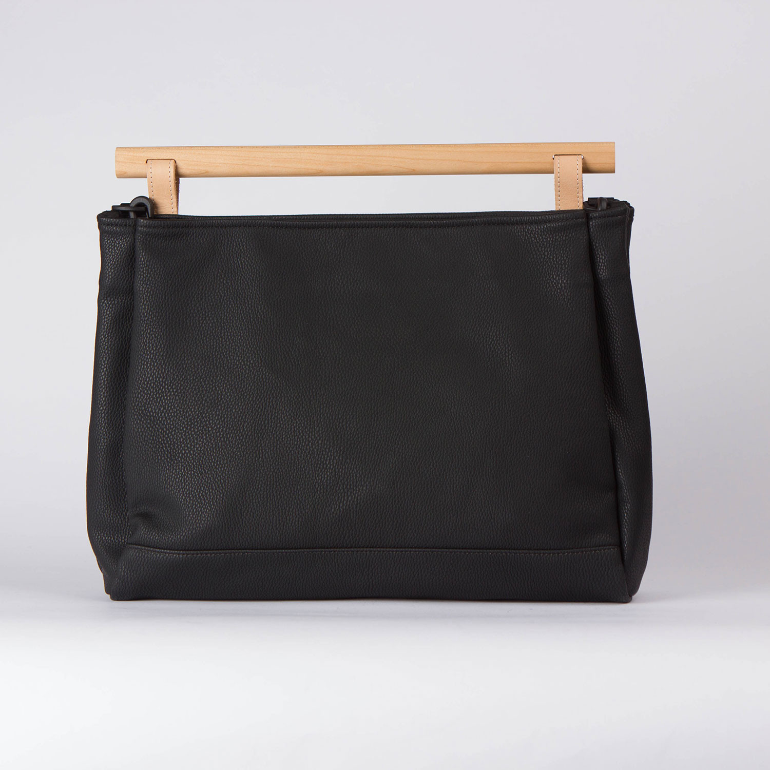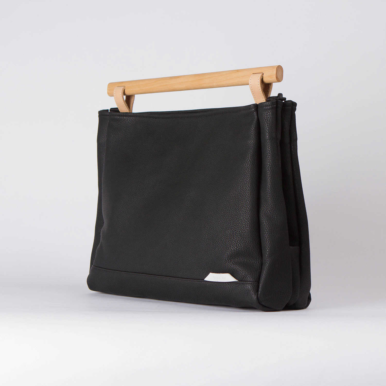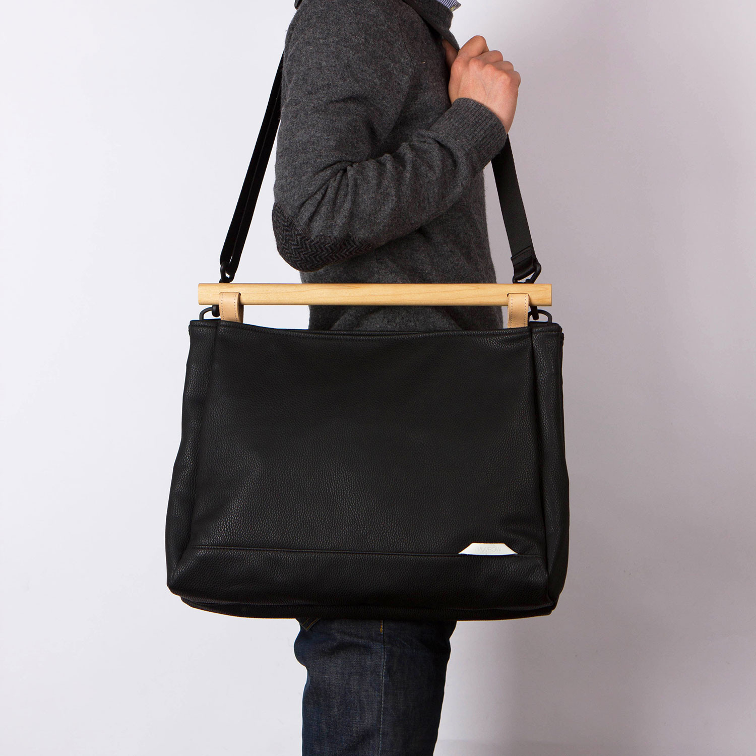 With luxe vegan leather and a sturdy and sophisticated maple wood handle, the Sylvan Laptop Shoulder Bag 121 features an easy-insert external pocket for magazines and newspapers and various internal pockets that can hold phones, pens, wallets, etc.