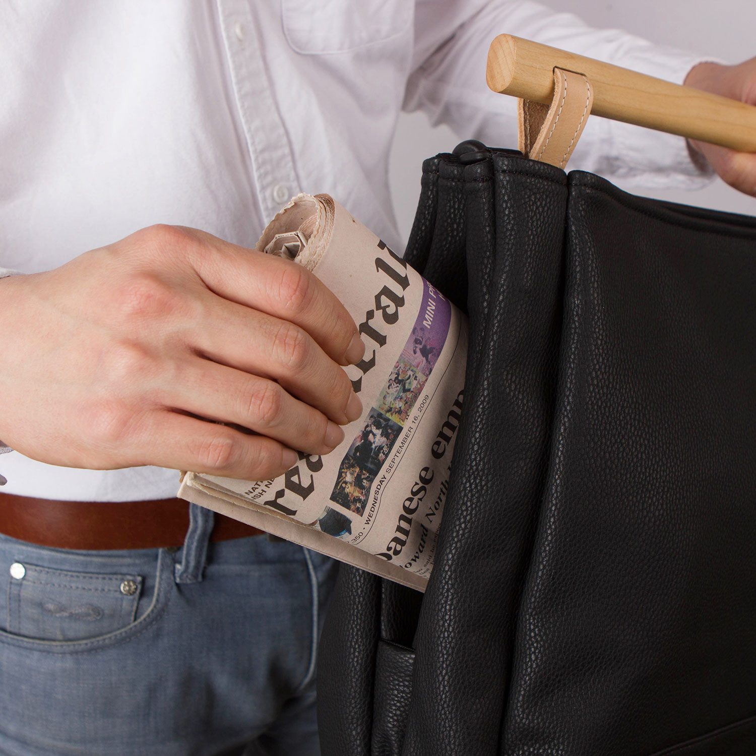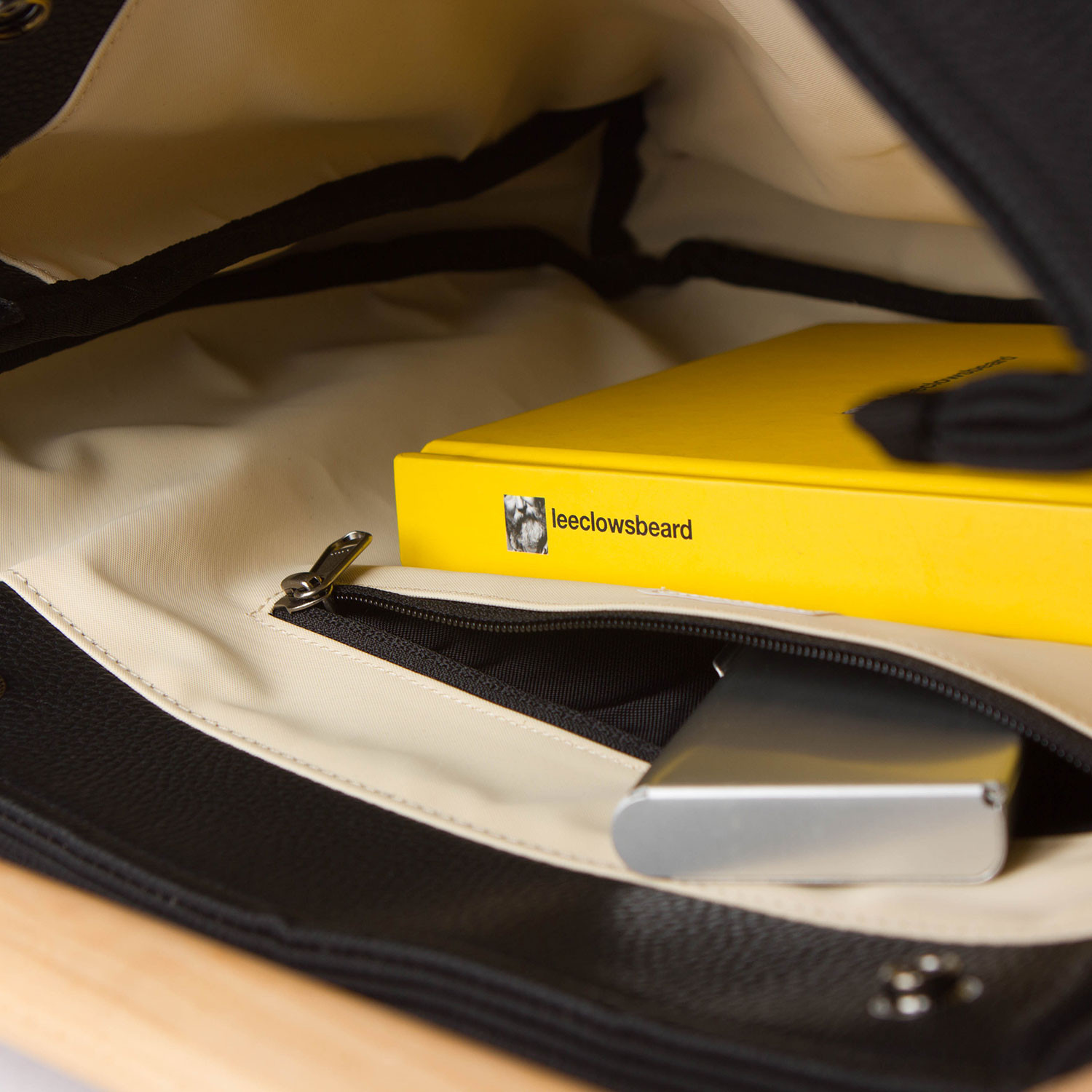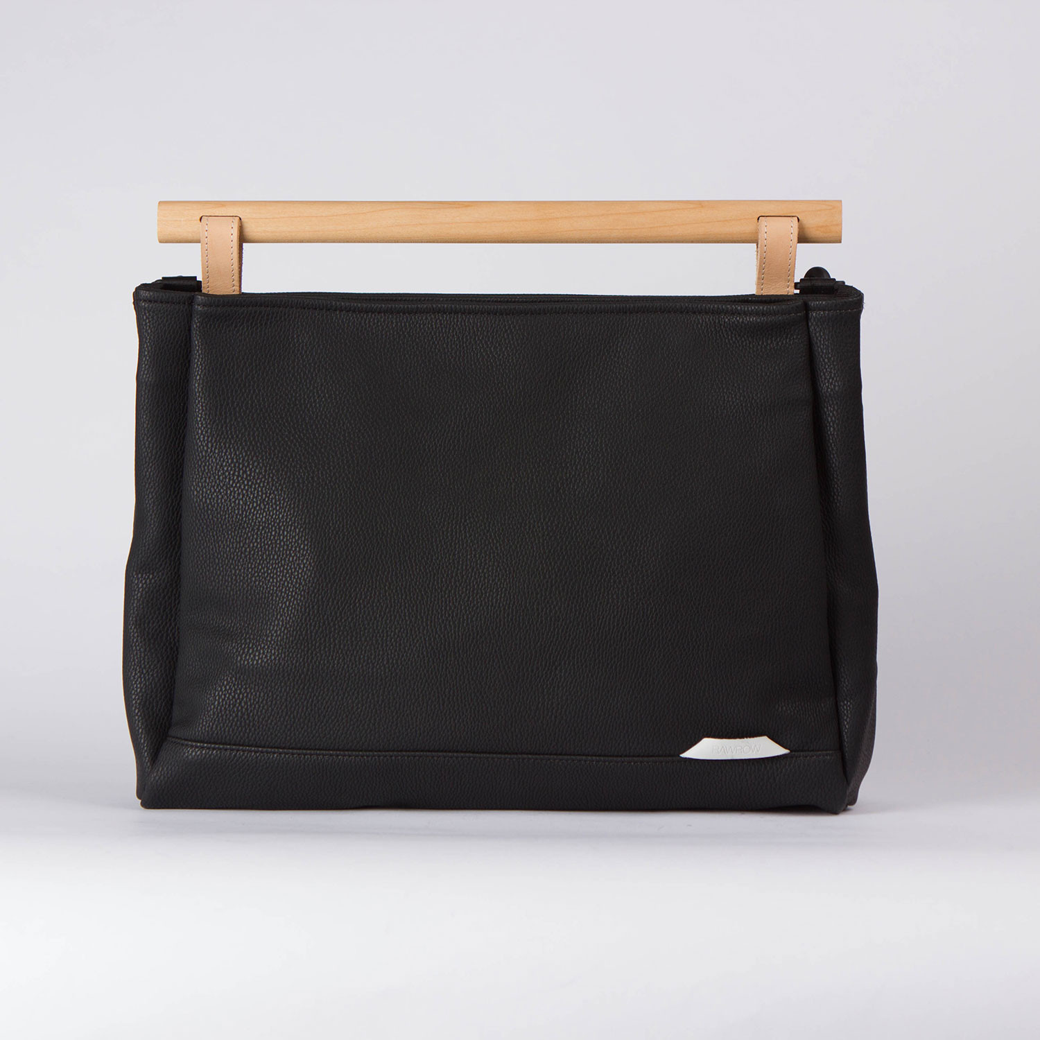 With luxe vegan leather and a sturdy and sophisticated maple wood handle, the Sylvan Laptop Shoulder Bag 121 features an easy-insert external pocket for magazines and newspapers and various internal pockets that can hold phones, pens, wallets, etc.