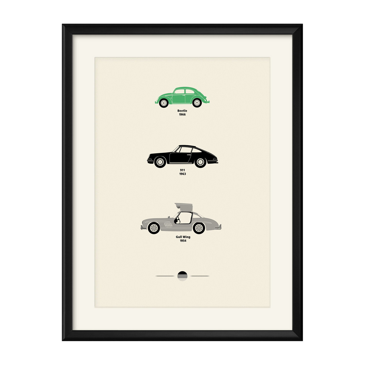 From the well-constructed frame of the 1966 Volkswagen Beetle to the high performance of the 1963 Porsche 911, this vintage Iconic German car print honoring the German approach to auto construction says it all. Practical, yet equally exotic, and of course, packed with plenty of racing spirit, these automobiles are remarkable. Mix in the novel 1954 Gull Wing set in grey, with its legendary doors propped open, and this print will take you from zero to perfection before you can even blink an eye.