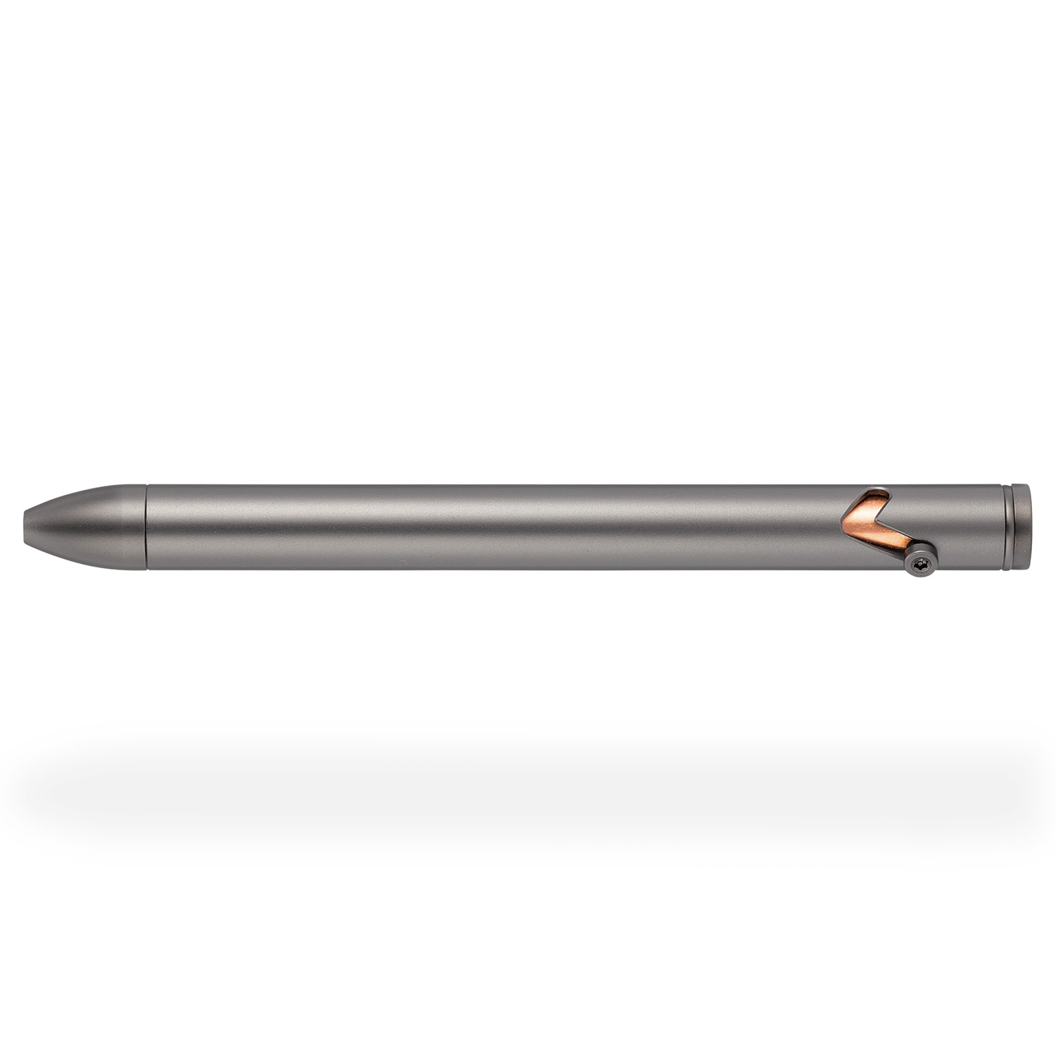 With a flick of your thumb, the bolt mechanism easily slides through the unique shaped channel to open or close the pen in one satisfying fluid motion, making it very responsive and fidget friendly. The removable deep carry pocket clip, copper barrel, and custom torx T6 hardware are all subtle design elements that add to the elegance of this minimalist design. The solid yet portable, pocket friendly size makes this the perfect on the go EDC pen as well as an emergency self defense pen and glass breaker.