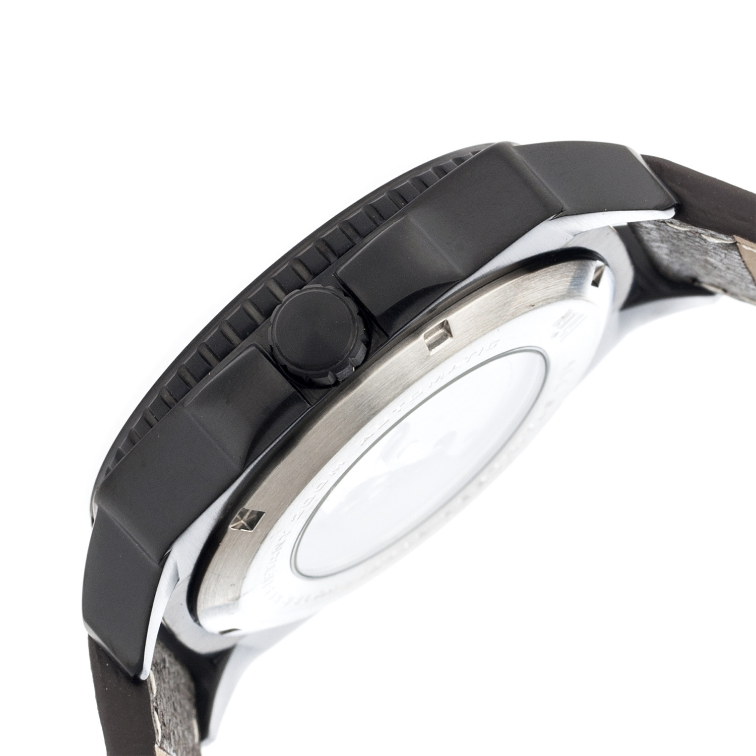 Band Color: Dark Brown Leather; Band Width: 22mm near case; 20mm near clasp/buckle; Bezel Color: Black; Case: Black + Square-Shaped; Case Finish: Satin + Stainless Steel; Case Thickness: 13mm; Case Width: 44mm; 51mm with crown; Clasp/Buckle: Strap Buckle; Dial: Black + Analog; Hand Color: Black; Movement: Chinese + Automatic; Time Zones: Single; Water Resistance: 20 ATM; Other Features: Brushed-Finish Dial, Observation Caseback, Uni-Directional Bezel, Screw-Down Crown, Crown Protector, Luminous Hands, Seconds Sub-Dial
