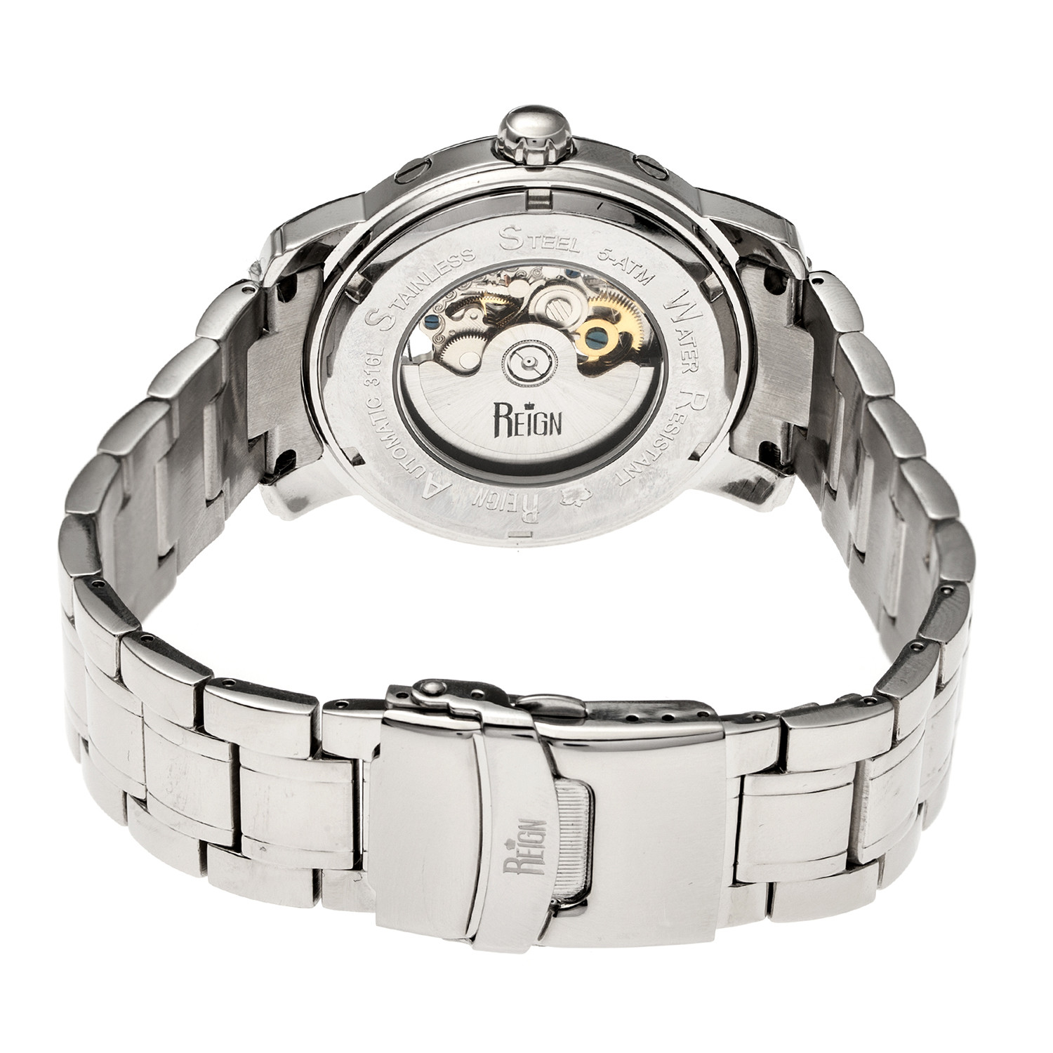 Band Color: Silver Stainless Steel; Band Width: 22mm near case; 20mm near clasp/buckle; Bezel Color: Silver; Case: Silver + Circle-Shaped; Case Finish: Polished + Stainless Steel; Case Thickness: 12mm; Case Width: 45mm; 48mm with crown; Clasp/Buckle: Fold-Over Push-Button Deployment; Dial: Black + Analog; Hand Color: Silver; Movement: Chinese + Automatic; Time Zones: Single; Water Resistance: 5 ATM; Other Features: Skeleton Dial, Obvseration Caseback, Luminous Hands