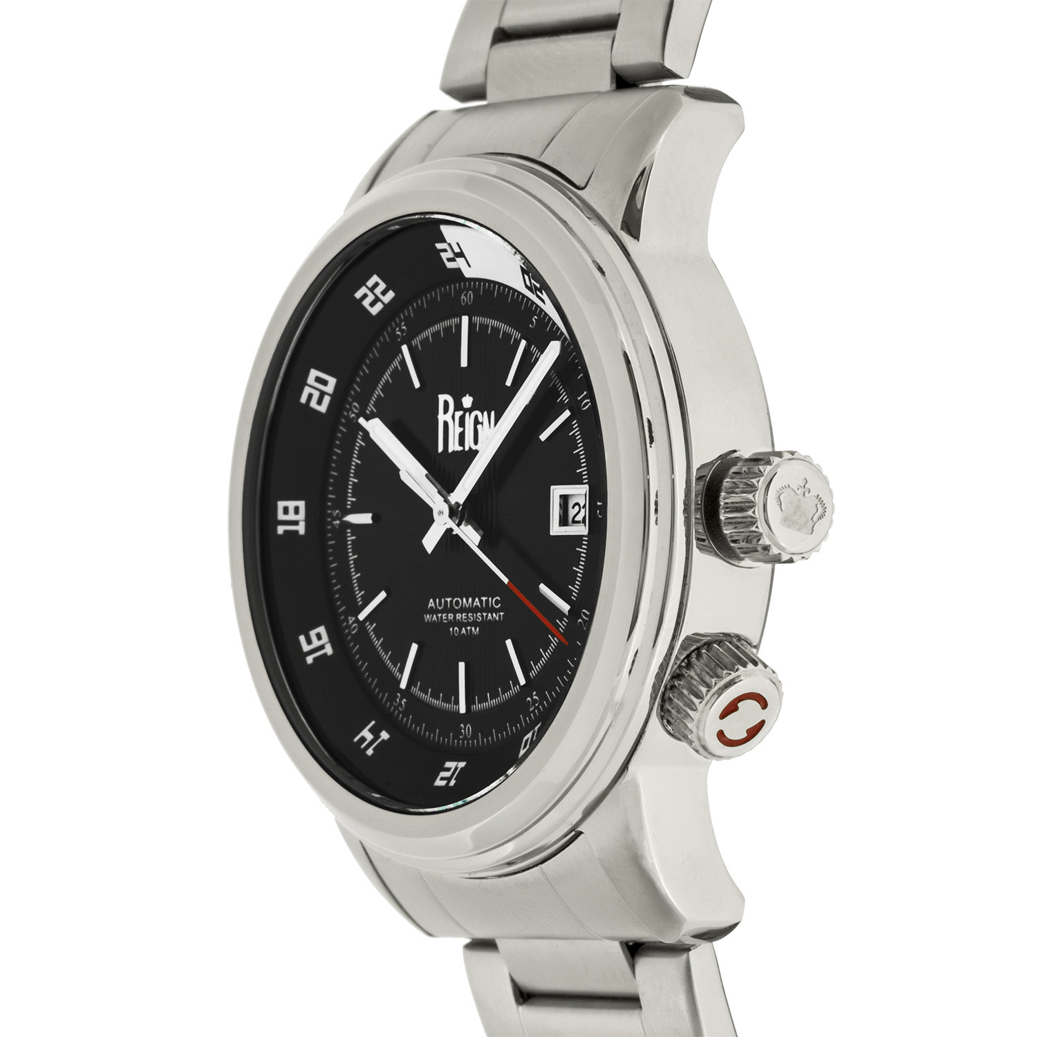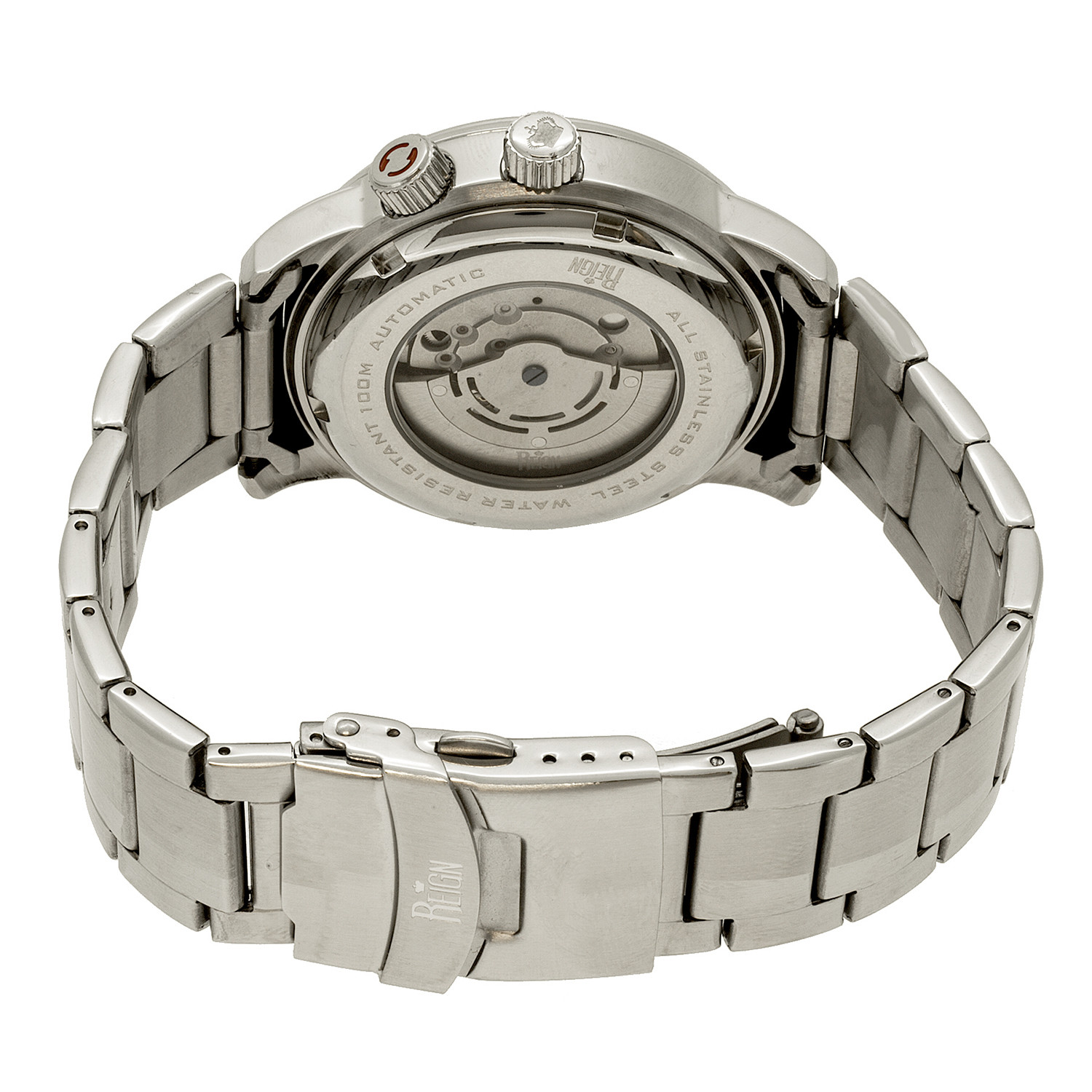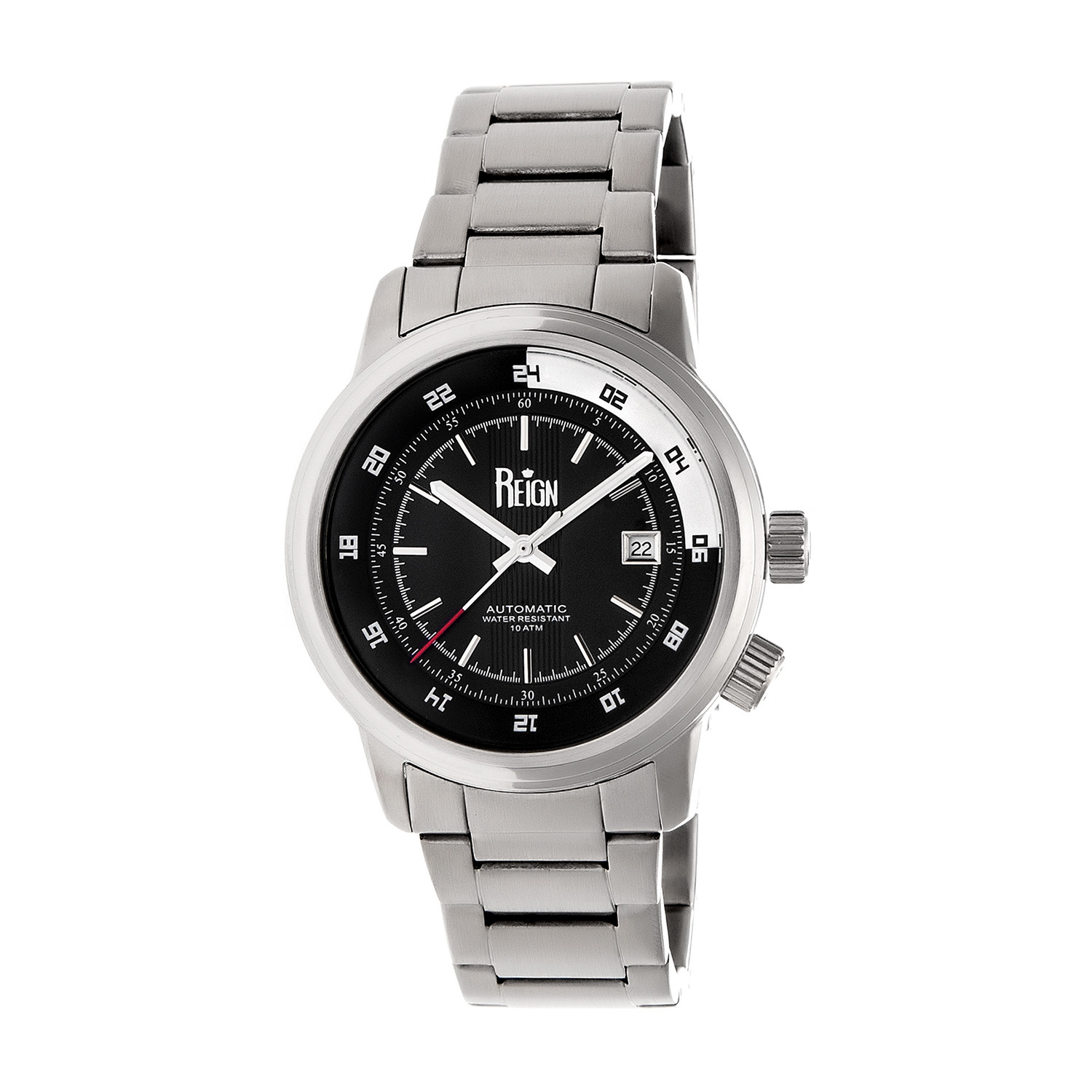 Band Color: Silver Stainless Steel; Band Width: 22mm near case; 20mm near clasp/buckle; Bezel Color: Silver; Case: Silver + Circle-Shaped; Case Finish: Polished + Stainless Steel; Case Thickness: 15mm; Case Width: 43mm; 46mm with crown; Clasp/Buckle: Fold-Over Push-Button Deployment; Dial: Black + Analog; Hand Color: Silver; Movement: Chinese + Automatic; Time Zones: Single; Water Resistance: 10 ATM; Other Features: Rotating 24-Hour Outer Ring, Observation Caseback, Luminous Hands, Date Display