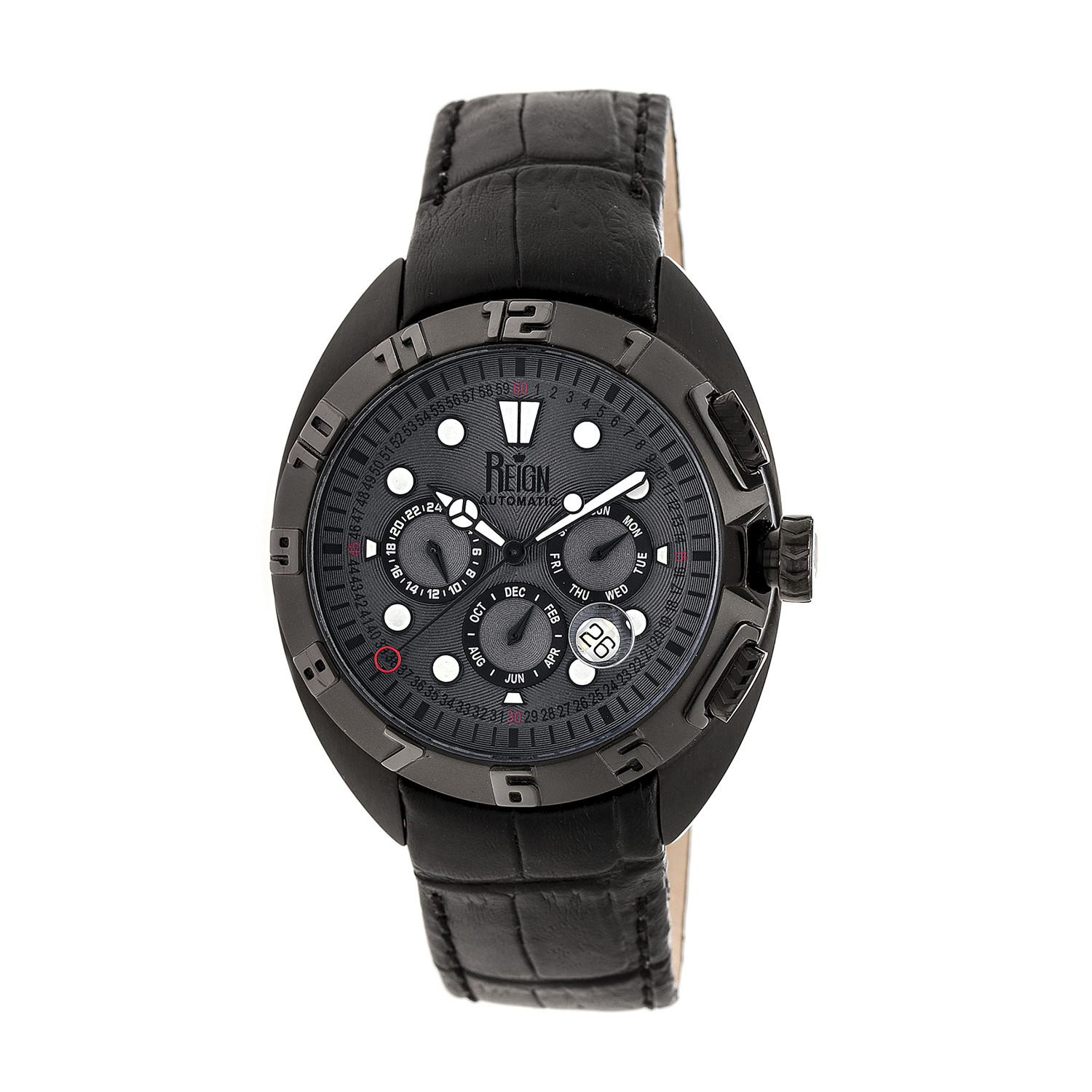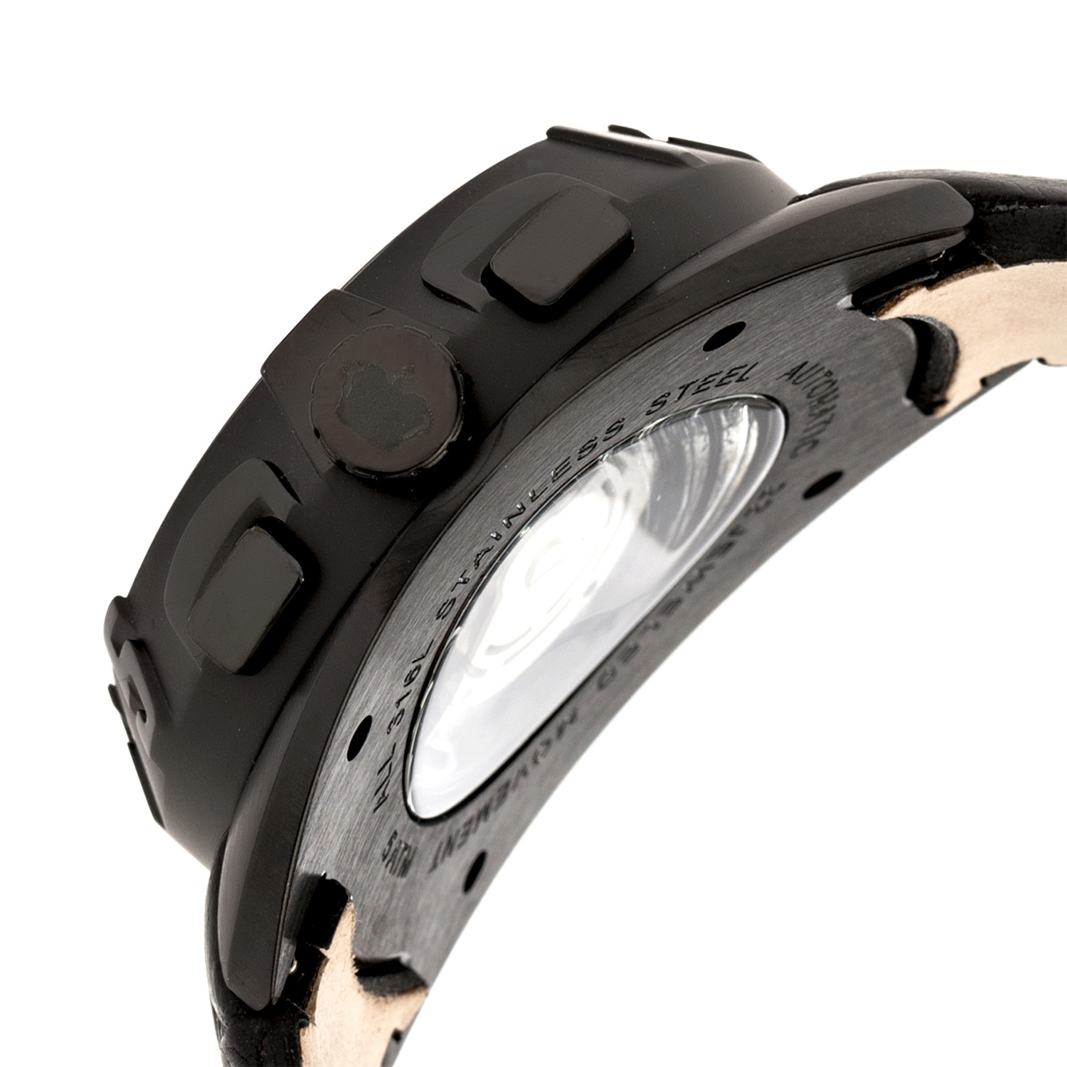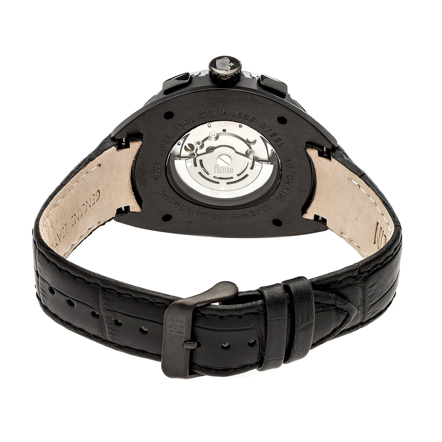 Band Color: Black Leather; Band Width: 22mm near case; 20mm near clasp/buckle; Bezel Color: Black; Case: Black + Circle-Shaped; Case Finish: Matte + Stainless Steel; Case Thickness: 14mm; Case Width: 43mm; 47mm with crown; Clasp/Buckle: Strap Buckle; Dial: Charcoal + Analog; Hand Color: Black; Movement: Chinese + Automatic; Time Zones: Single; Water Resistance: 5 ATM; Other Features: Engraved Pattern Dial, Observation Caseback, Luminous Hands, Luminous Markers, Day Sub-Dial, Magnified Date Display, Month Sub-Dial, 24-Hour Sub-Dial