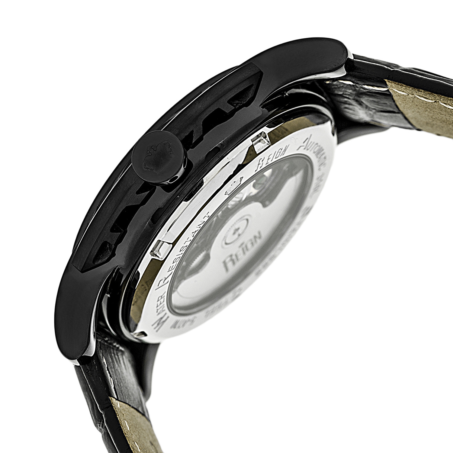 Band Color: Black Leather; Band Width: 22mm near case; 20mm near clasp/buckle; Bezel Color: Black; Case: Black + Circle-Shaped; Case Finish: Polished + Stainless Steel; Case Thickness: 14mm; Case Width: 44mm; 47mm with crown; Clasp/Buckle: Strap Buckle; Dial: Black + Analog; Hand Color: Black; Movement: Chinese + Automatic; Time Zones: Single; Water Resistance: 5 ATM; Other Features: Skeleton Dial, Observation Caseback, Luminous Hands, Luminous Markers