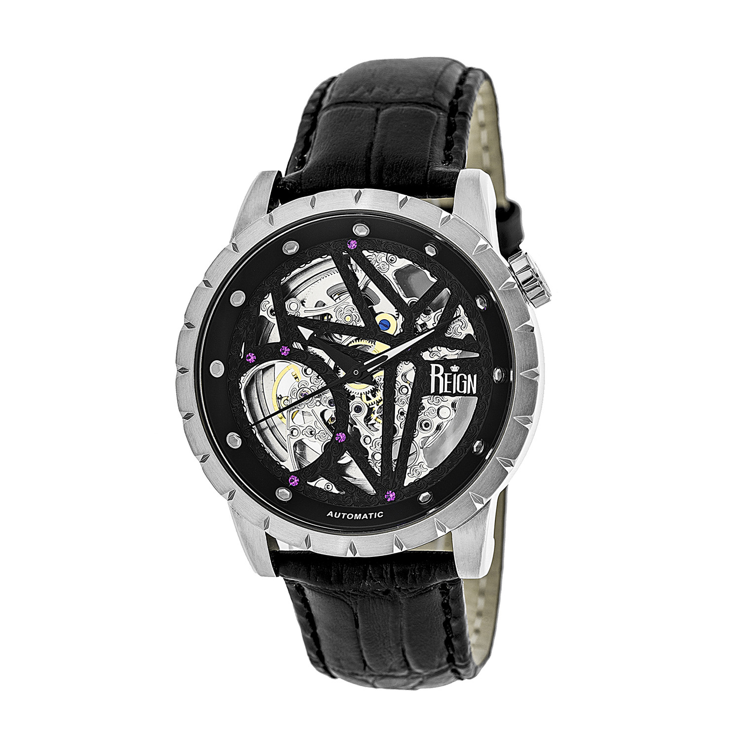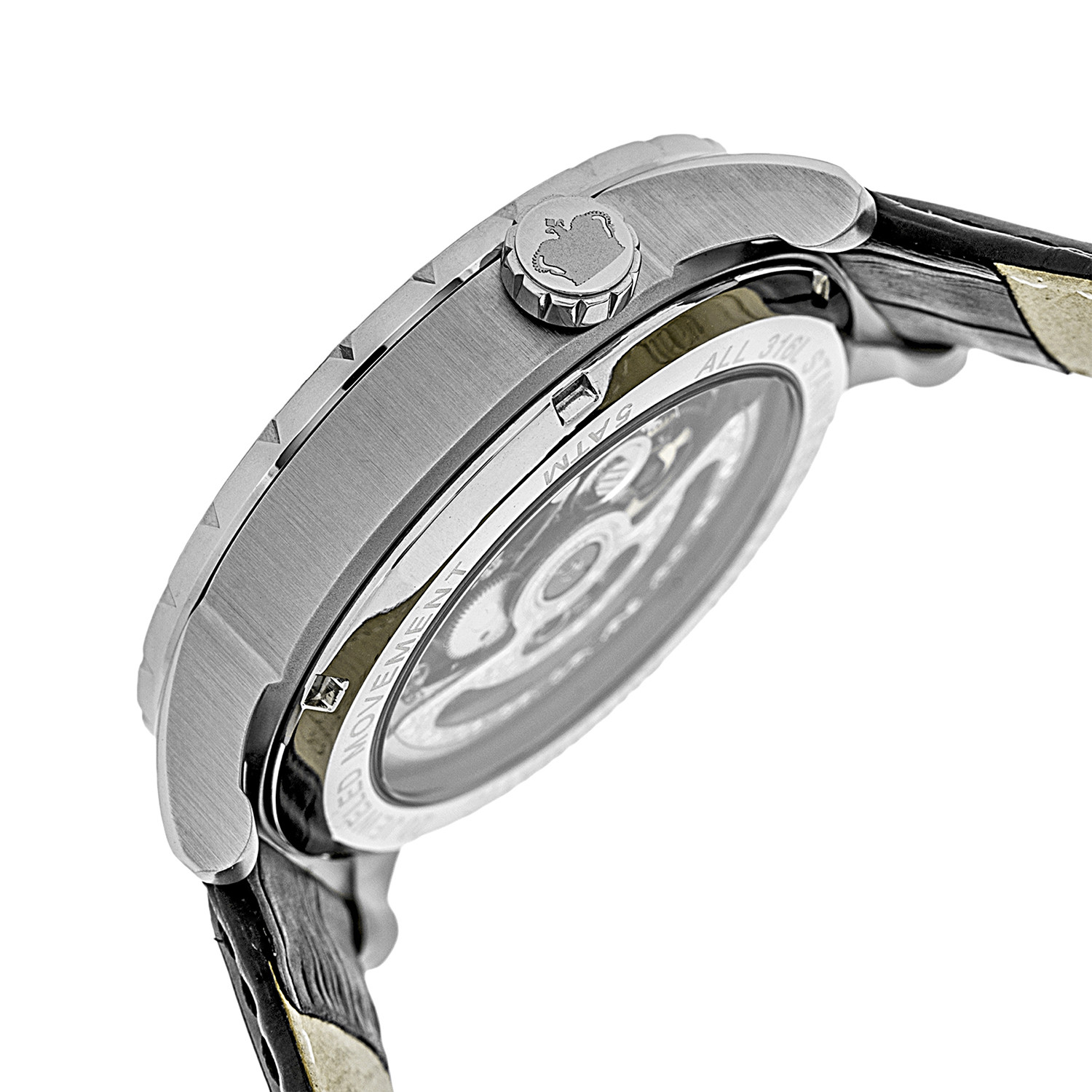 Band Color: Black Leather; Band Width: 22mm near case; 20mm near clasp/buckle; Bezel Color: Silver; Case: Silver + Circle-Shaped; Case Finish: Brushed + Stainless Steel; Case Thickness: 13mm; Case Width: 43mm; 46mm with crown; Clasp/Buckle: Strap Buckle; Dial: Black + Analog; Hand Color: Black; Movement: Chinese + Automatic; Time Zones: Single; Water Resistance: 5 ATM; Other Features: Skeleton Dial, Observation Caseback, Luminous Hands