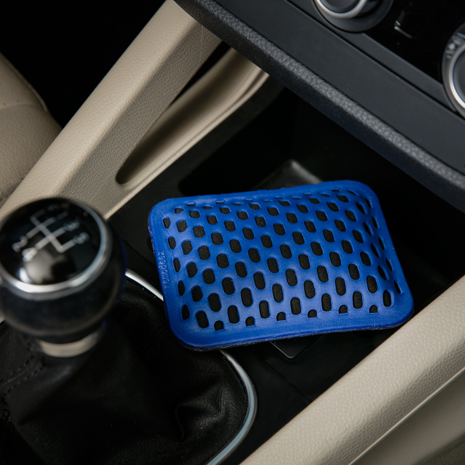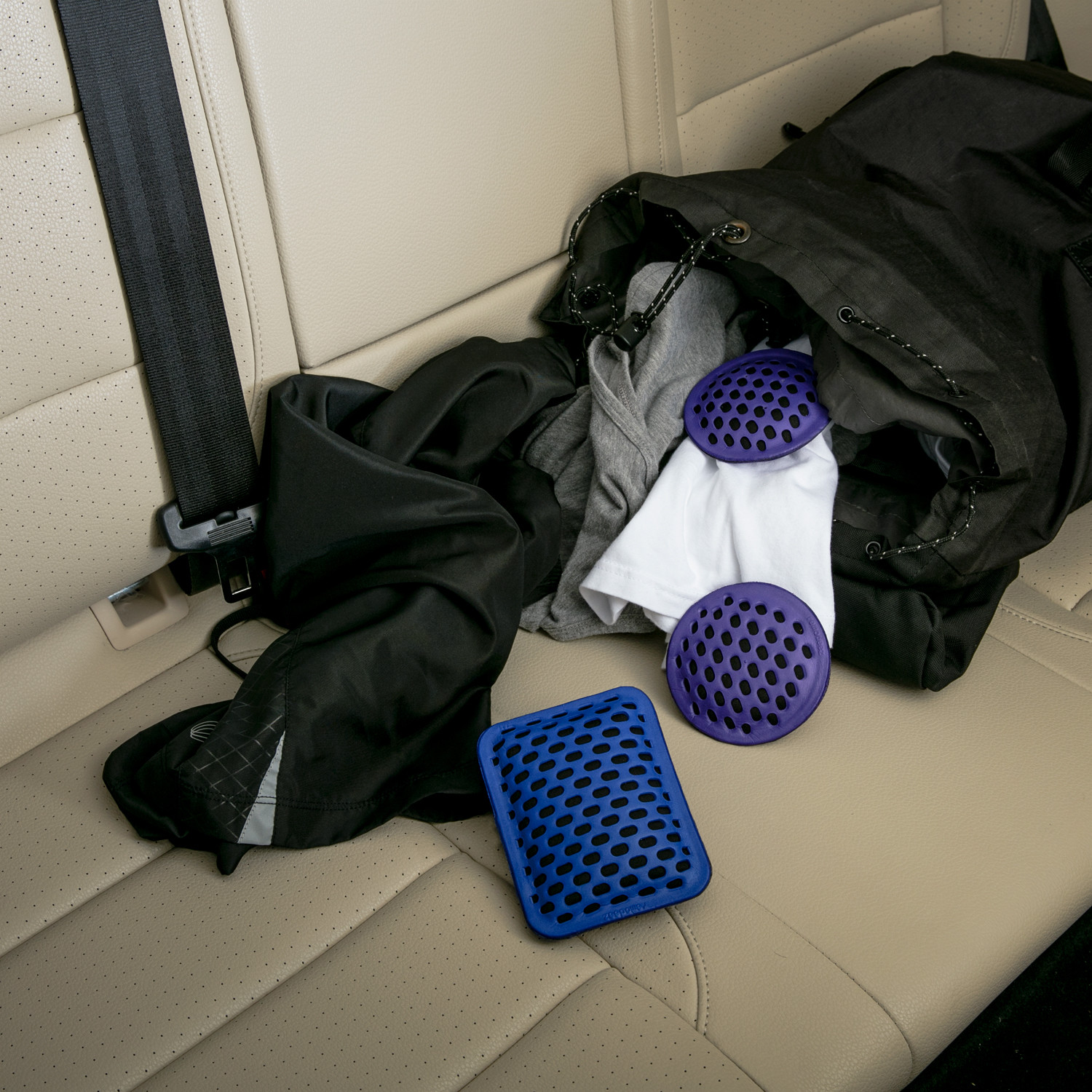 Use the purple Odor Eliminator on the go product to remove odor and moisture between the gym or while traveling. It's great in luggage, gym bags, backpacks, and lockers. The navy Odor Eliminator to remove odor and moisture in your car, boat, or RV. It's great under the seat, in the trunk, on your console and other places where odors lurk.