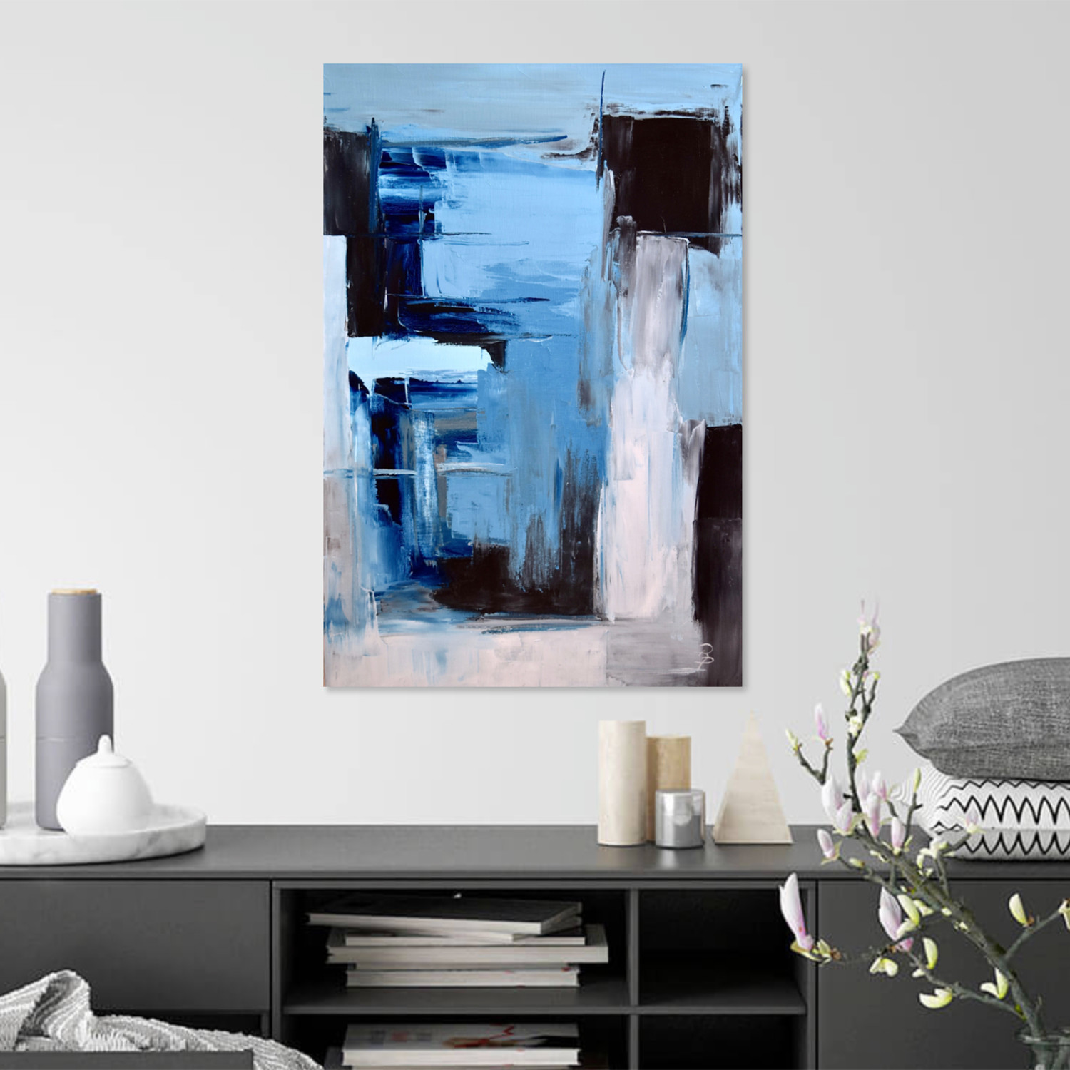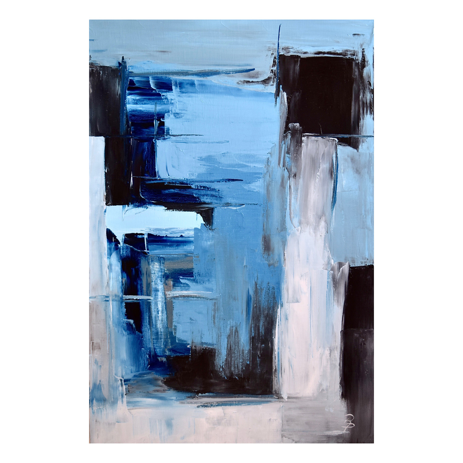 "Avenue" is a cool, vibrant piece of varying shades of blue, white, and black, creating a serene scene of what appears as an avenue with facades and awnings. See what you want to see in this abstract piece, and let it be a modern touch to your space. The layers of oil paint create depth and texture on a beautifully textured linen canvas.