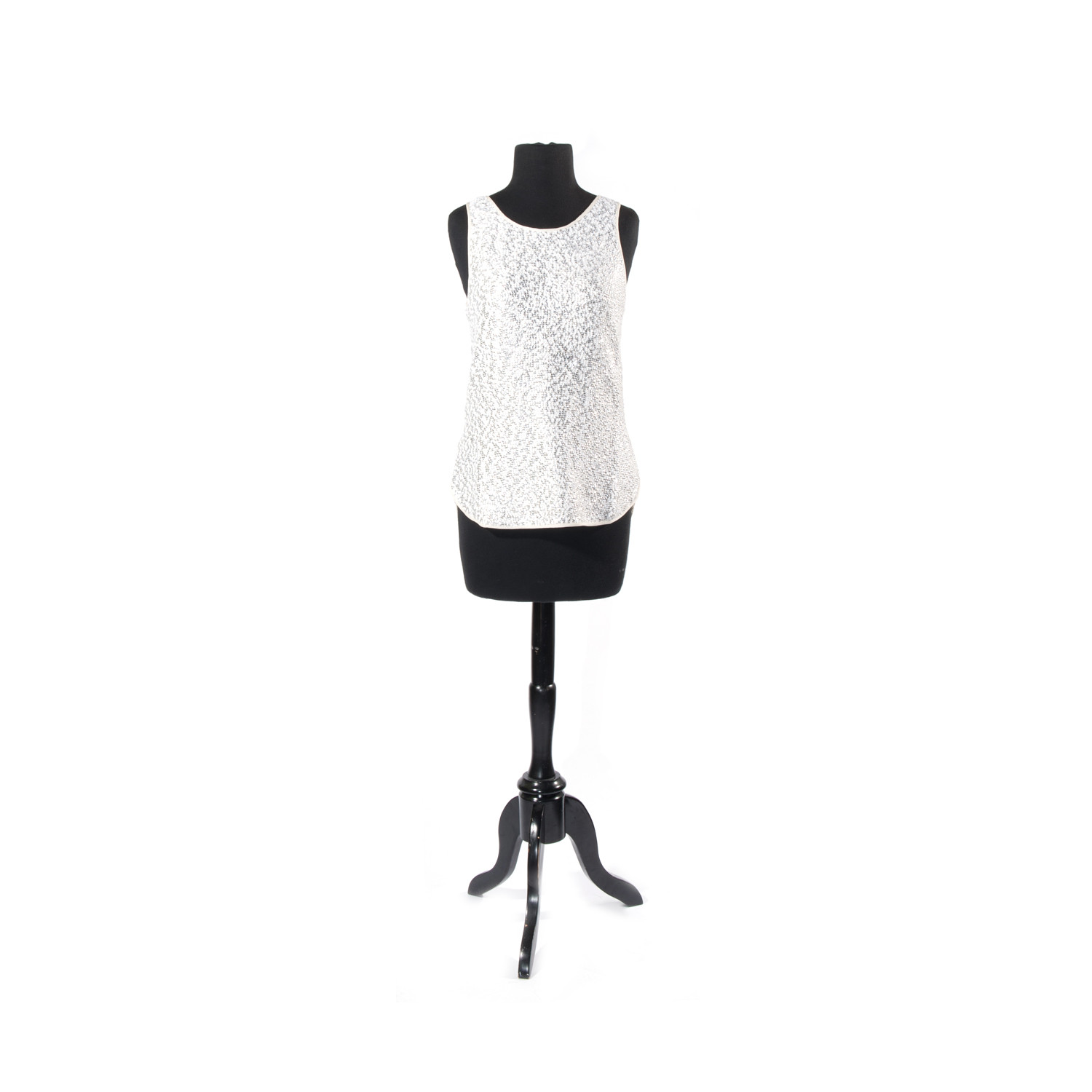 A white silk shell and a sparkling beaded layer gently fall on this beautiful piece by Renzo + Kai. Simple and elegant this pristine tank will compliment any occasion with either pants or a skirt..