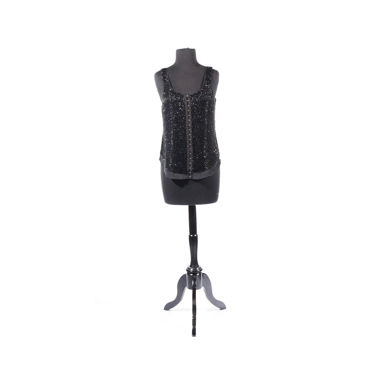 With an easy open and close hook/button front, enjoy the ease of putting on and taking off this glamorous tank. Glistening in stark black beads, this sparkling top will stand out when enjoying a night out on the town!