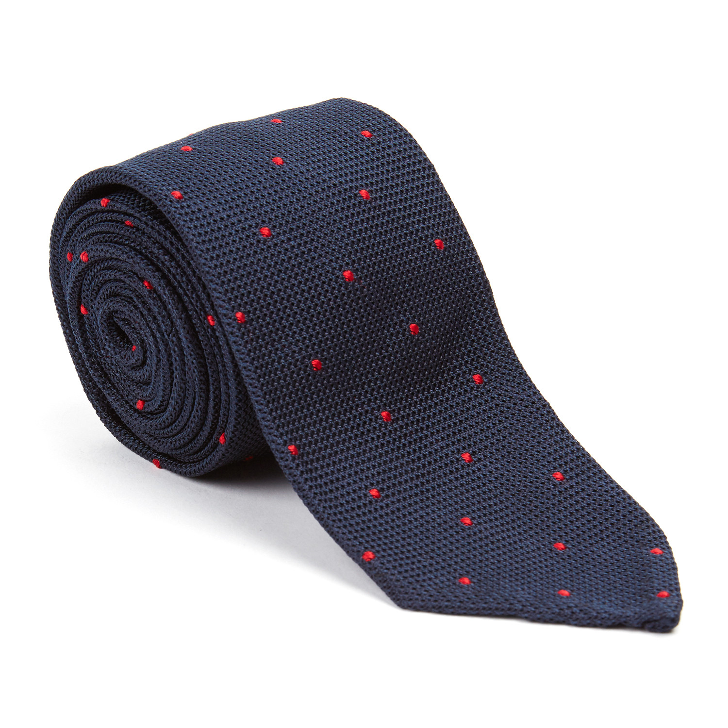 Grenadine is made from fine, hard-twisted silk yarn on ancient wooden looms. Typically seen in dark solid colors, this grenadine tie ups the ante with contrasting polka dots to add visual interest. Res Ipsa's grenadine fabric is custom-woven by one of Italy's finest mills— the official supplier of fabric for ecclesiastical robes worn by the last eight Popes. Handmade in New York City, with distinctive finishes like a grosgrain neckband, self-loop and self-tipping, it's the ultimate in neckwear.