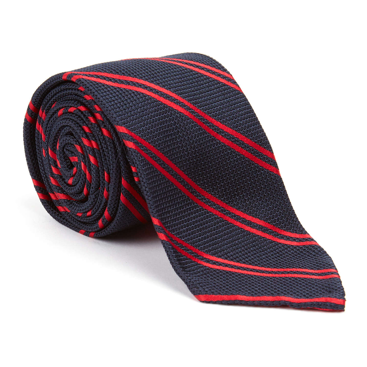 Grenadine is made from fine, hard-twisted silk yarn on ancient wooden looms. Typically seen in dark solid colors, this grenadine tie ups the ante with contrasting stripes to add visual interest. Res Ipsa's grenadine fabric is custom-woven by one of Italy's finest mills— the official supplier of fabric for ecclesiastical robes worn by the last eight Popes. Handmade in New York City, with distinctive finishes like a grosgrain neckband, self-loop and self-tipping, it's the ultimate in neckwear.